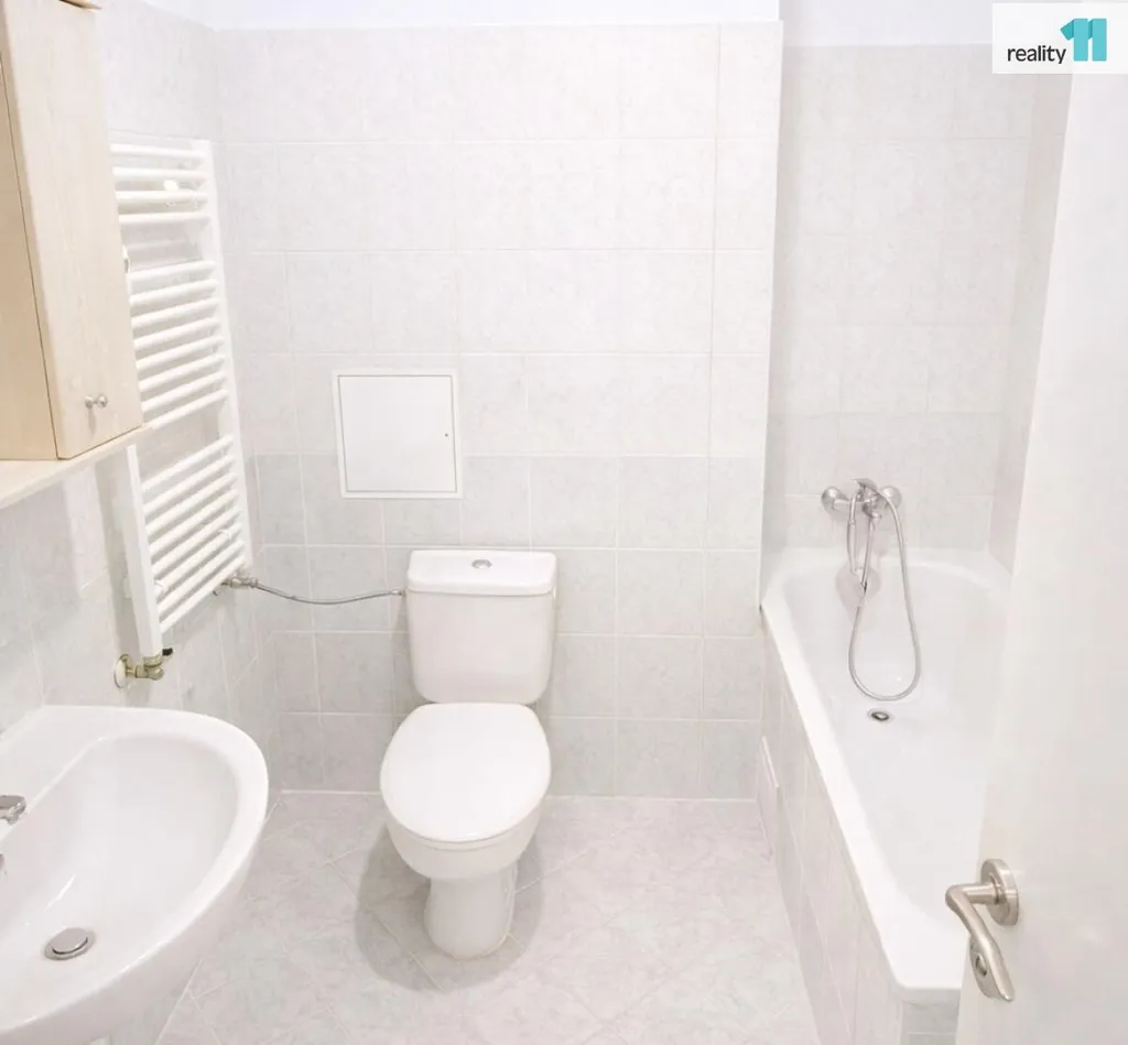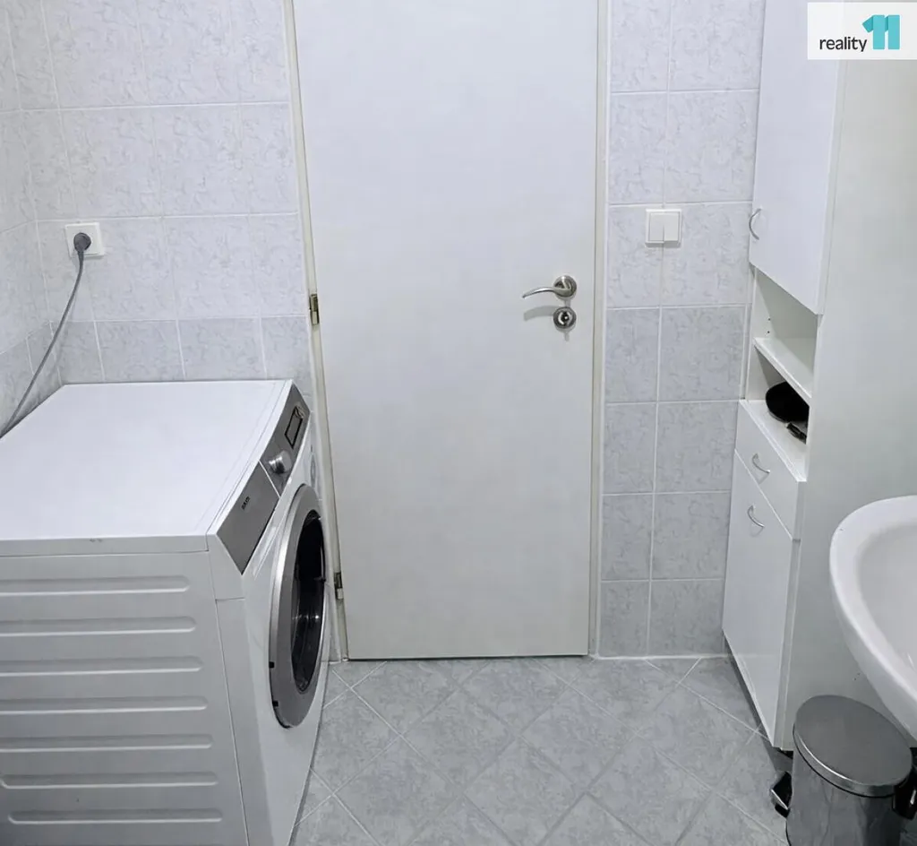 V koupelně je pračka, vana a WC.