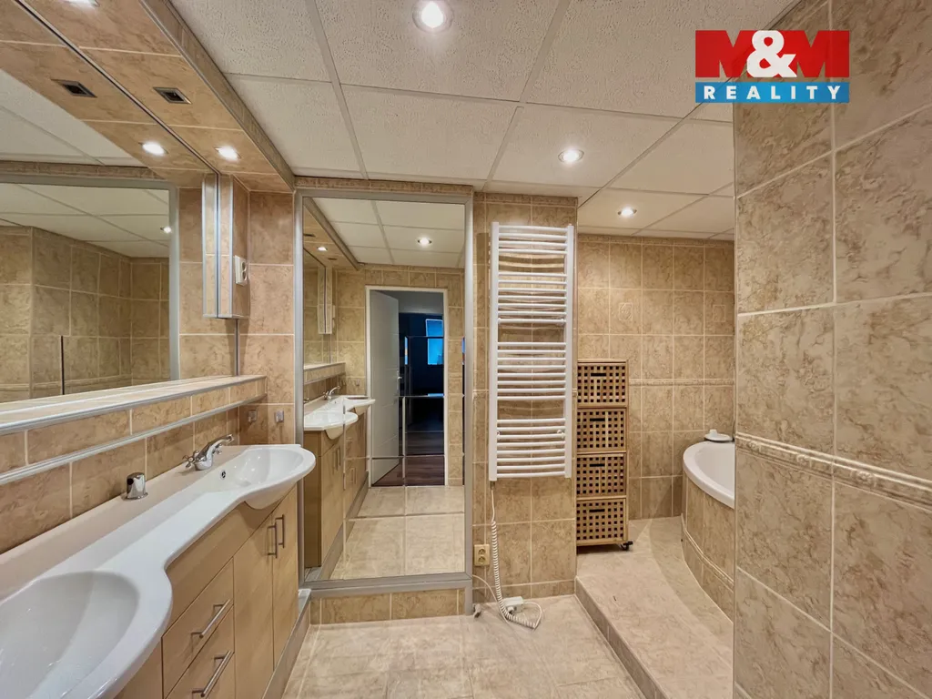 Dominantou bytu je nadstandartně řešená koupelna s rohovou vanou a dvěma umyvadly a praktická šatna na chodbě, která poskytuje dostatek úložného prostoru.