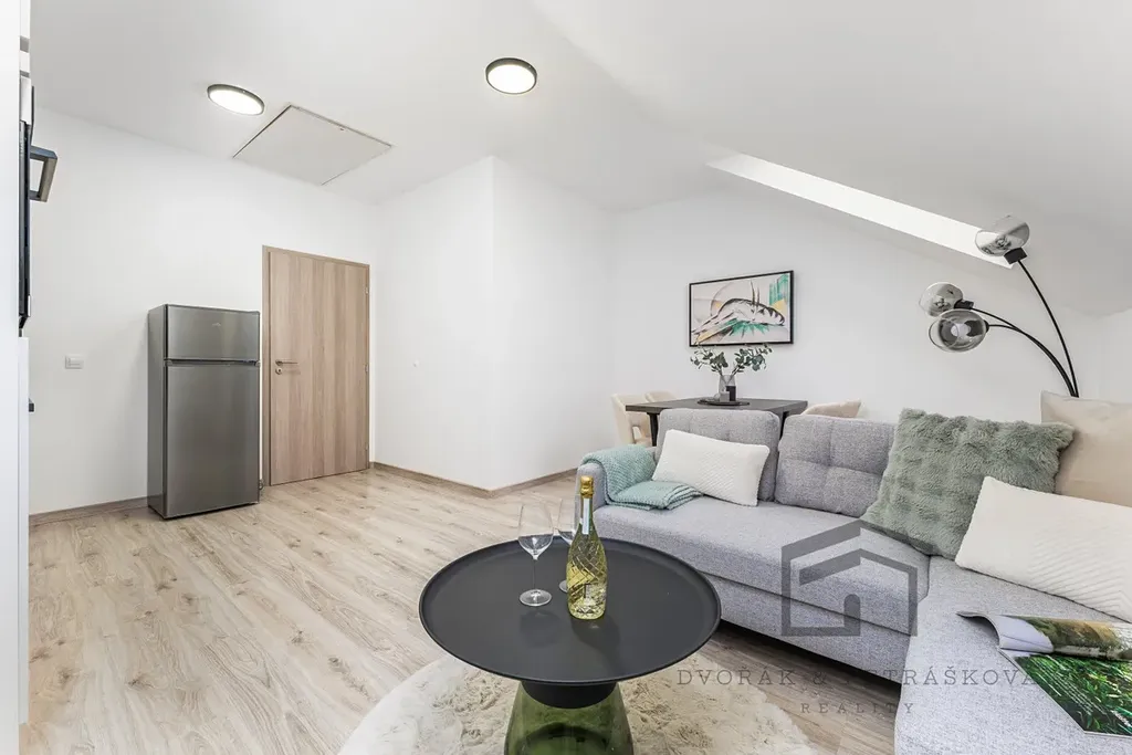 Zrekonstruovaný byt 2+kk s půdním prostorem, se nachází ve 3.patře cihlového domu BEZ výtahu. Byt prošel rekonstrukcí a je vhodný pro jednotlivce nebo pár. Bytová jednotka disponuje vstupní chodbou s oddělenými vstupy do jednotlivých pokojů. Obývací pokoj s kuchyňským koutem je vybavený myčkou, horkovzdušnou troubou, indukční varnou deskou, digestoří, dostatkem úložného prostoru a samostatně stojící lednicí s mrazákem. Součástí pronájmu je i veškerý nábytek na fotografiích. Výška stropu je 2,6 m2. Z obývacího pokoje je přístup na půdu, kterou lze využívat jako úložný prostor - zde jsou nízké stropy a chybí odvětrávání.
