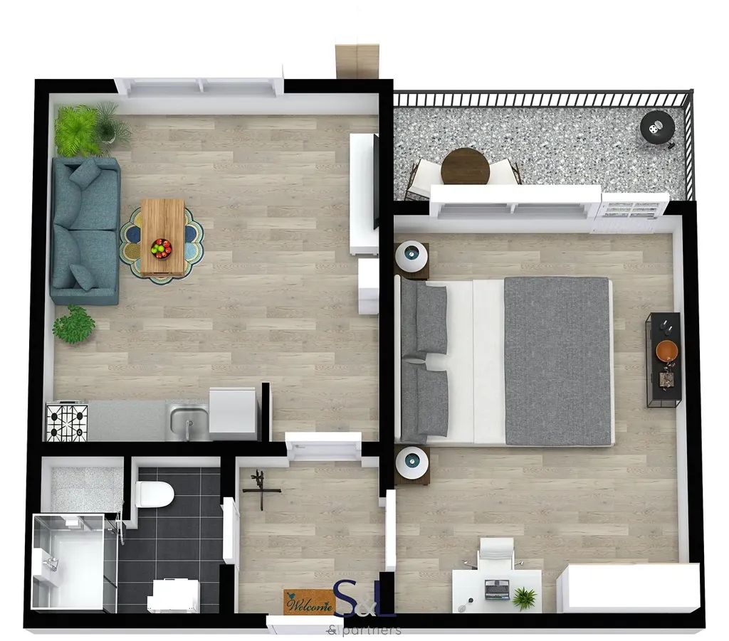 Dispozice bytu se skládá z chodby, ze které se dostaneme do koupelny se sprchovým koutem, obývacího pokoje spojeného s kuchyňskou linkou a do ložnice, ze které je vstup na lodžii.
