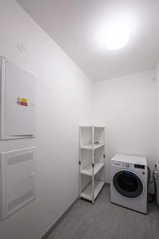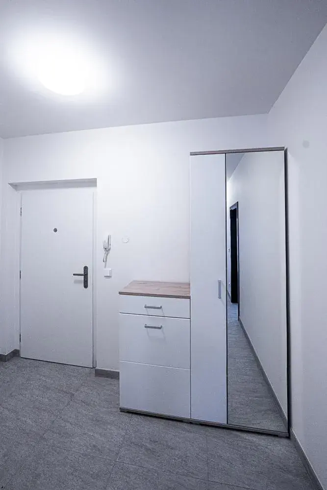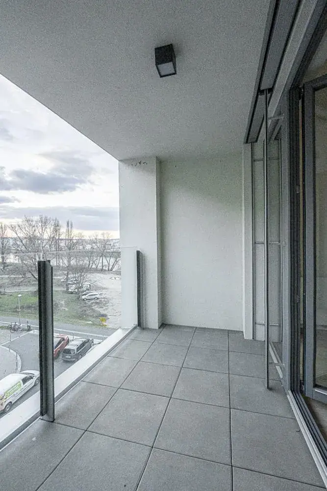 Dispozice: vstupní hala, velký obývací pokoj (orientovaný na jih a západ) s kuchyňským koutem, lodžie s výhledem směrem k Vltavě a Pražskému hradu, ložnice, koupelna, samostatné WC, technická místnost s pračkou.