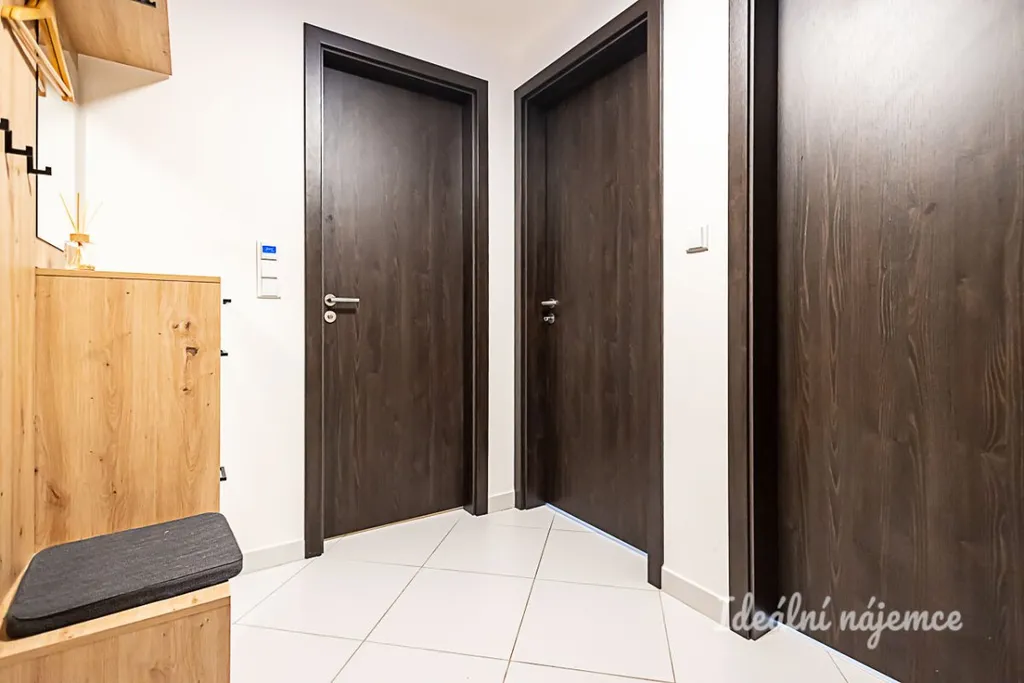 Dispozičně byt nabízí prostornou předsíň, komoru s policemi i plně vybavenou koupelnu včetně pračky i sušičky. Hlavní dominantou je obývací pokoj s kuchyňskou linkou ve které jsou všechny potřebné spotřebiče včetně myčky. Obývací pokoj je spojen s prostornou lodžií, která nabízí nádherný výhled třeba i k večernímu posezení. Druhý pokoj taktéž nabízí vstup do lodžie a také úložné prostory v podobě vestavěné skříně.