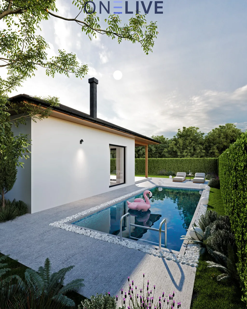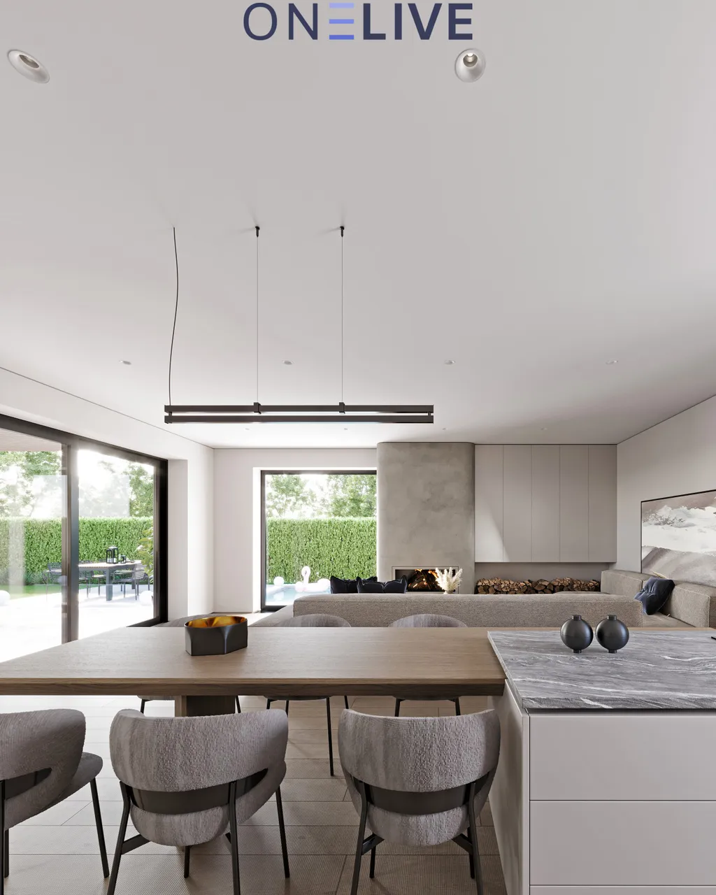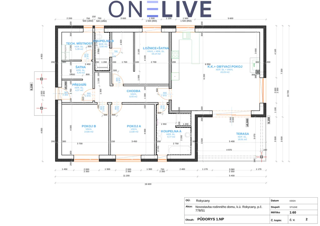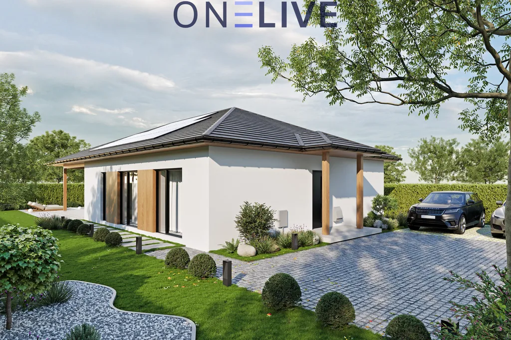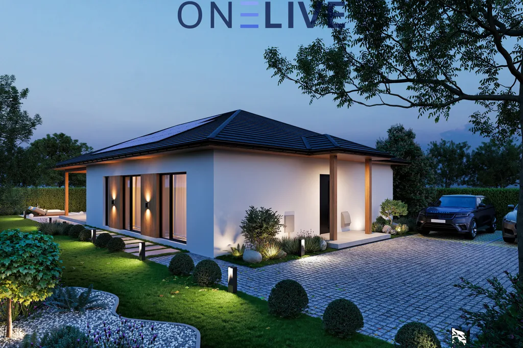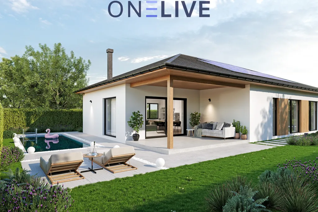 Dominantou domu je prostorný obývací pokoj s kuchyňským koutem a krbem, který se otevírá na zastřešenou terasu, ideální pro rodinné oslavy nebo relaxaci. Díky velkým oknům až k zemi je prostor prosvětlený a působí velice příjemně. Dům je navržen jako nízkoenergetický, s kvalitními materiály – zdivo Ytong (30 cm), zateplení polystyrenem (20 cm), izolační plastová okna s trojsklem a zateplená střecha s izolační vatou. Vytápění zajišťuje teplovodní podlahový systém s tepelným čerpadlem, a pro maximální komfort je připravena instalace klimatizace v každém pokoji. Všechna okna jsou vybavena venkovními žaluziemi pro stínění i bezpečnost.