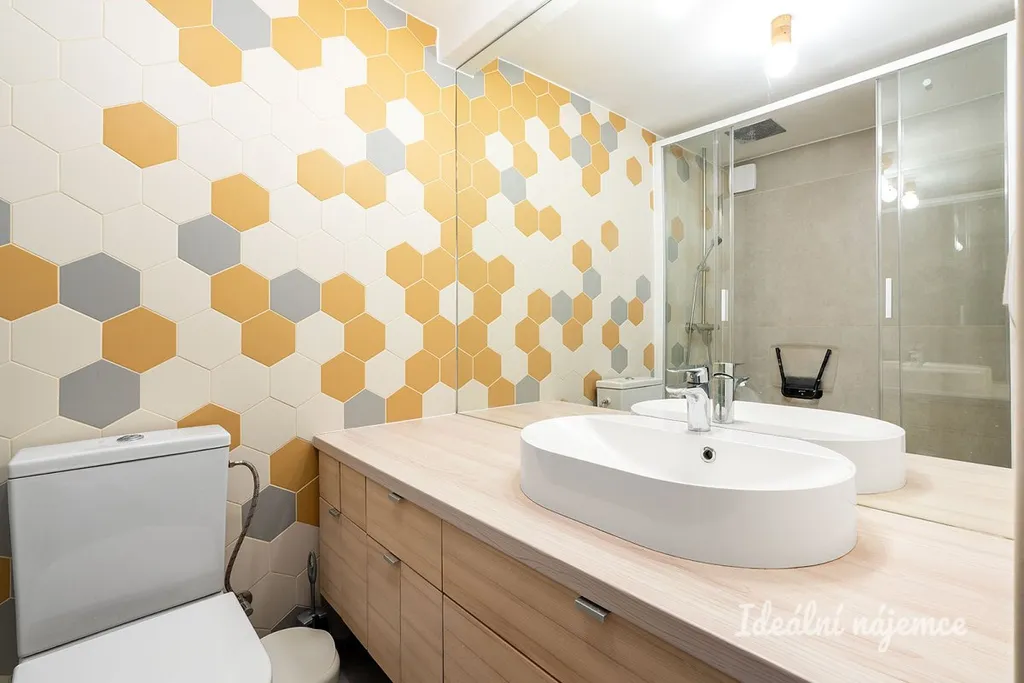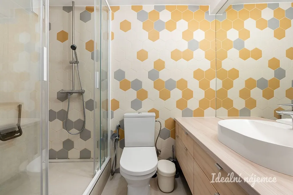 Interiér je nabízen jako částečně vybavený, což budoucím nájemníkům poskytuje ideální příležitost k zařízení domova přesně podle vlastního vkusu a potřeb. Srdcem bytu je obývací prostor s plně vybaveným kuchyňským koutem, kde nechybí lednice s mrazákem, myčka, elektrická i mikrovlnná trouba, varná deska a výkonná digestoř. Dvě samostatné ložnice nabízejí variabilní využití – jedna může sloužit jako hlavní ložnice a druhá jako dětský pokoj nebo klidná pracovna. Moderní koupelna disponuje sprchovým koutem, umyvadlem a toaletou.