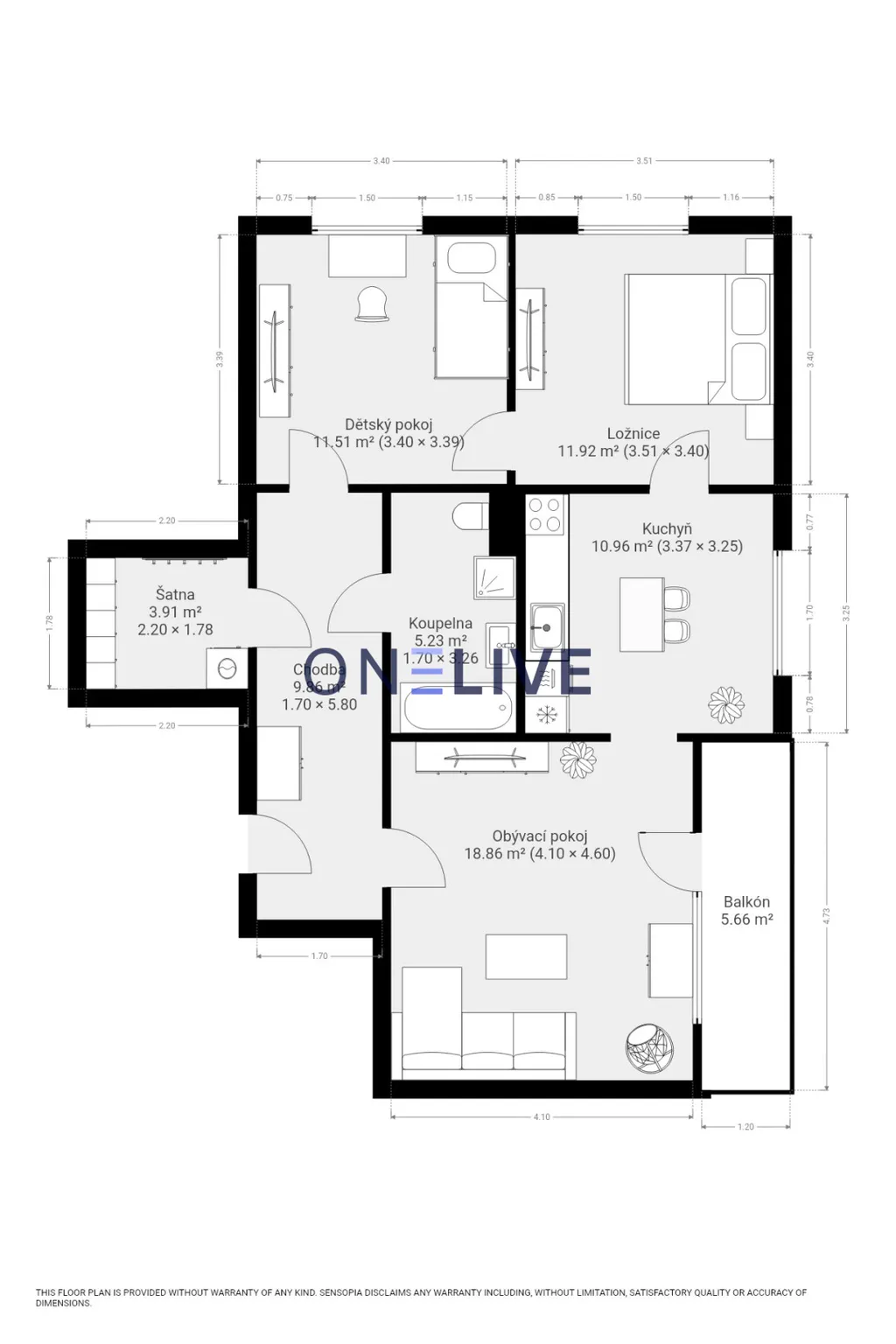 Byt se skládá z obývacího pokoje, samostatné kuchyně, ložnice, dětského pokoje, prostorné chodby, technické místnosti s šatnou a koupelny. Koupelna je vybavena vanou, sprchovým koutem a WC, což zajišťuje vysoký komfort každodenního užívání.