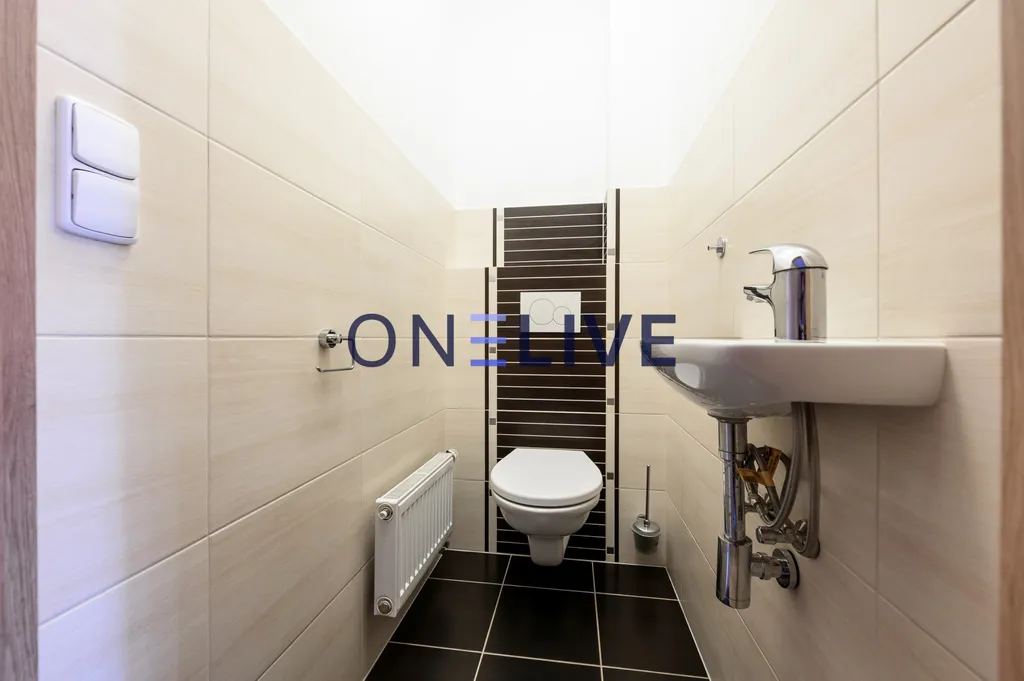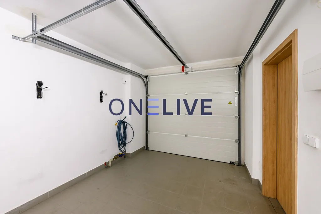 V přízemí najdete světlý a prostorný obývací pokoj s kuchyňským koutem. Součástí je moderní kuchyňská linka s vestavěnými spotřebiči. Velká okna umožňují přístup přirozeného světla a vstup na terasu se zahradou. V obývacím pokoji je k dispozici rozkládací sedací souprava a obývací stěna. Dále se v přízemí nachází samostatná toaleta s umyvadlem, šatna, prádelna a garáž.