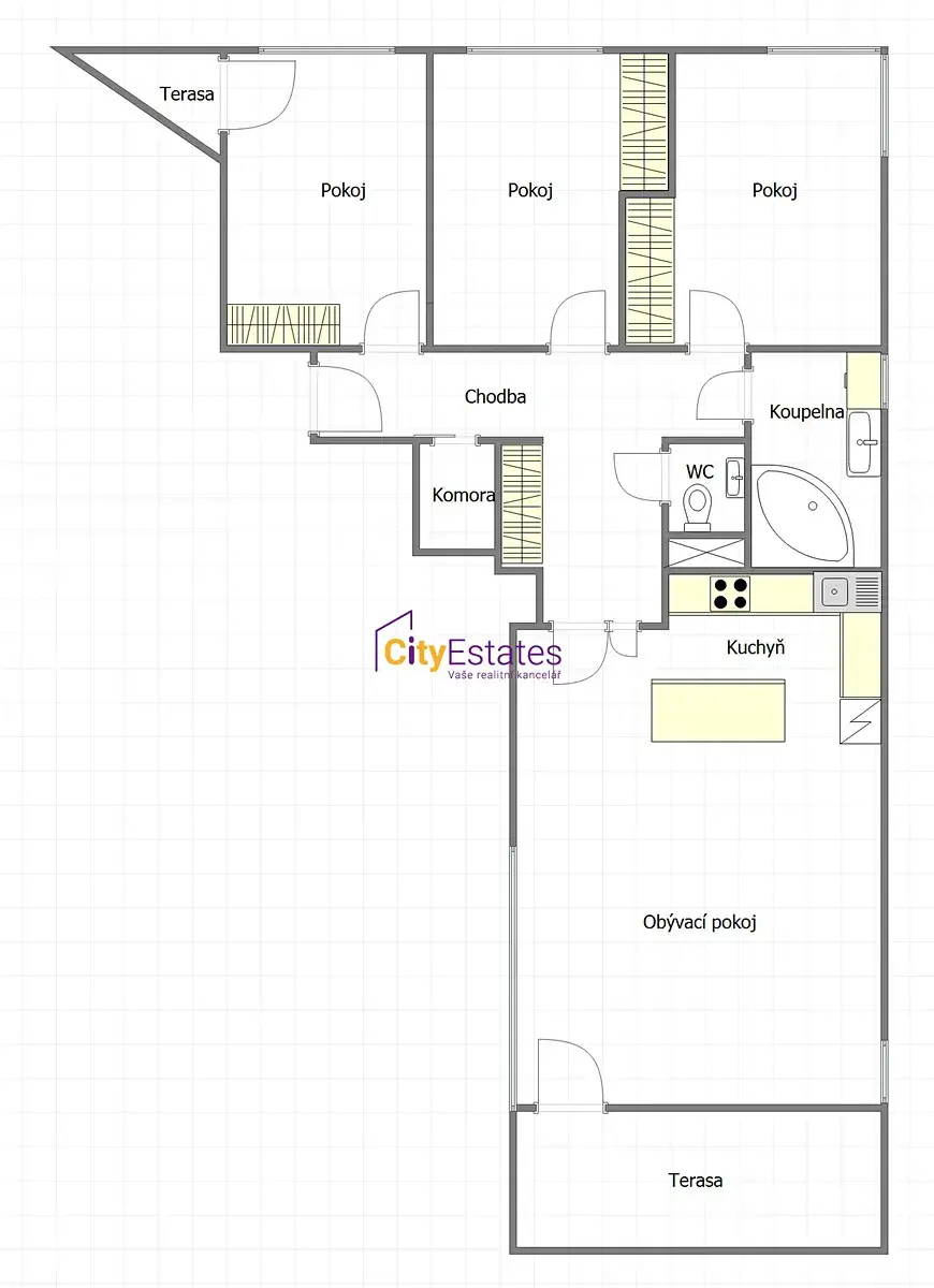Samotný byt má plochu 99 m2, terasa 10 m2, zasklený balkon 2 m2, sklep 3 m2. Byt je umístěn ve 3. patře cihlového bezbariérového domu s výtahem. Dispozice bytu je velmi dobře řešená. Byt je orientovaný na tři světové strany, z velkého obývacího pokoje s kuchyní vejdete přímo na jižní terasu, tři neprůchozí pokoje jsou orientovány na sever. Jeden pokoj a obývák mají atypické rohové okno. U pracovny je umístěn zasklený balkón. V prostorné koupelně je okno a je zde umístěna rohová vana. WC je samostatné. V bytě je také velmi praktická komora s úložným prostorem. V suterénu domu je zabezpečený sklep a garážové stání.