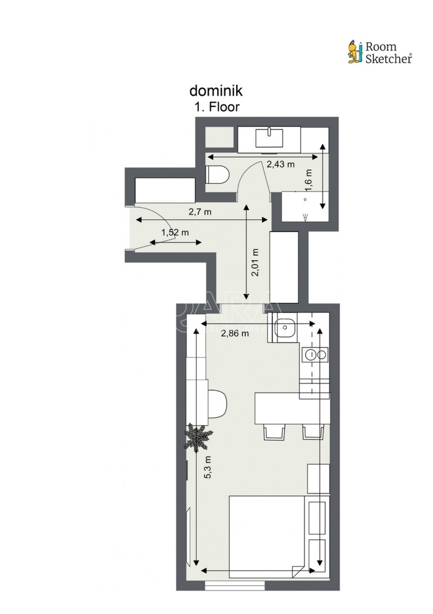 Byt je ve velmi dobrém stavu a má praktické uspořádání – menší rohová kuchyň s barovým pultem je propojená s obývacím pokojem. Dále je zde chodba ze které se dostanete do koupelny se sprchovým koutem a WC. Byt je připravený na bydlení či pronájem, bez nutnosti investic. Velkou výhodou je klimatizace, podlahové vytápění v koupelně a vybavení bytu (viz. fotografie) které je součástí prodeje.