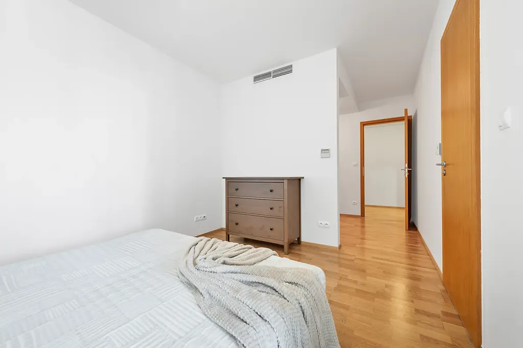 Obývací pokoj 34 m² velký a světlý, s východem na jednu z teras. Je vybaven nábytkem – v případě potřeby jej můžeme odstranit, pokud máte vlastní. Ložnice je rozdělena na dvě části – část s postelí a nočními stolky a druhou část, která slouží jako úložný prostor nebo může být využita jako pracovní prostor. Z ložnice je také výstup na terasu. Koupelna má vyhřívanou podlahu, což zvyšuje komfort užívání. Je komora s pračkou, a samostatné WC.