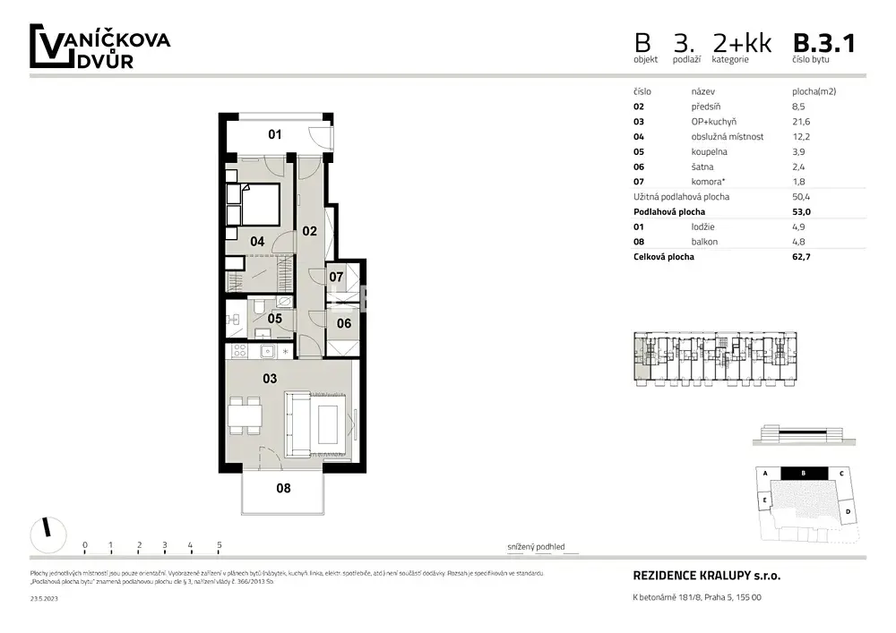 Moderní projekt Vaníčkova Dvůr vám nabízí k prodeji velkoryse řešený byt s dispozicí 2+kk o rozměrech 53,0 m² s balkonem 4,8 m² a lodžií 4,9 m². Byt se nachází ve 3. podlaží v nově vznikajícím projektu Vaníčkova Dvůr v srdci Kralup nad Vltavou.