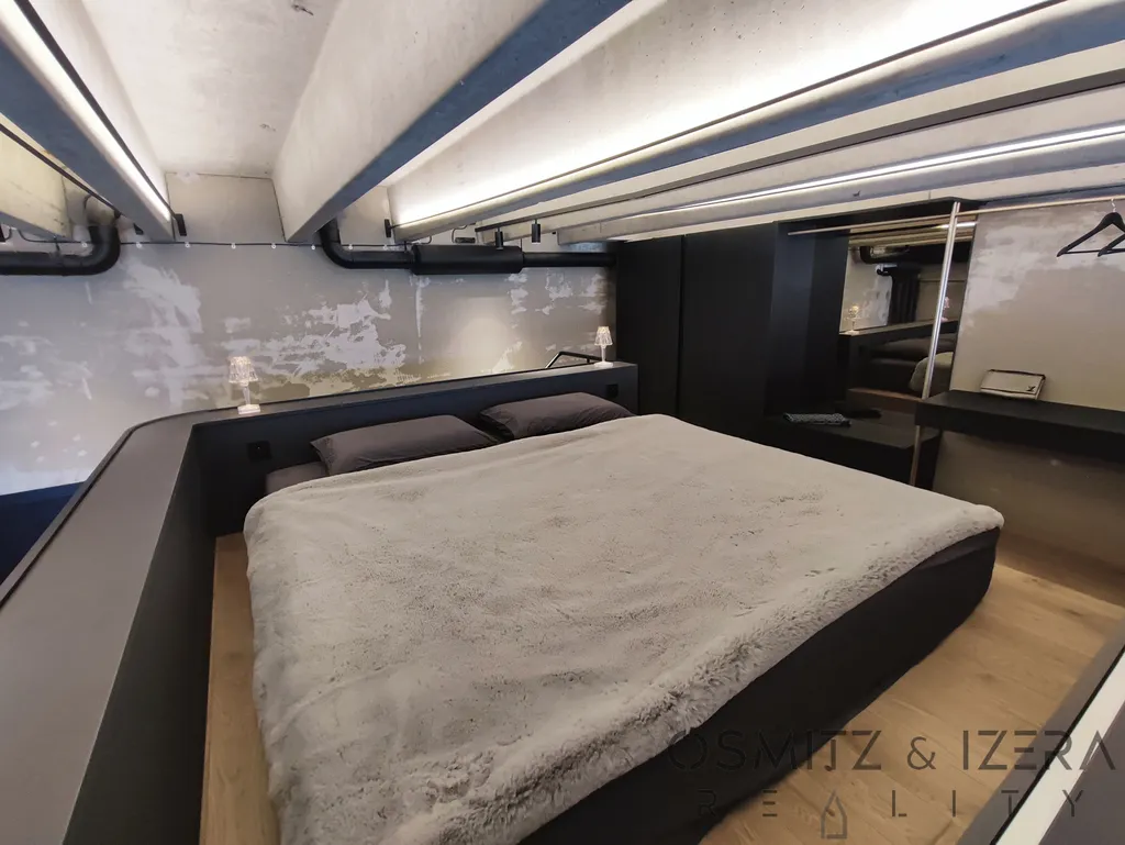 Loftový prostor se vyznačuje vysokými stropy, rozlehlým obývacím prostorem s kuchyní a galerií, která představuje soukromou ložnici. Každý detail byl promyšlen pro maximální pohodlí a styl. Otevřenost a vzdušnost bytového uspořádání vás okouzlí. K bytu náleží také prostorná terasa o velikosti 31 m², ideální pro letní grilování nebo jen tak k relaxaci s krásným výhledem na okolí.