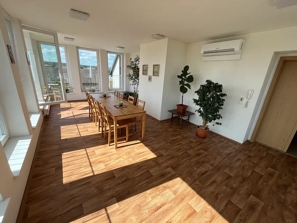 Pro nájemce jsou k dispozici dvě společenské místnosti a venkovní posezení za domem, vlastní parkovací místo a kóje k uložení věcí dle zájmu za poplatek.
