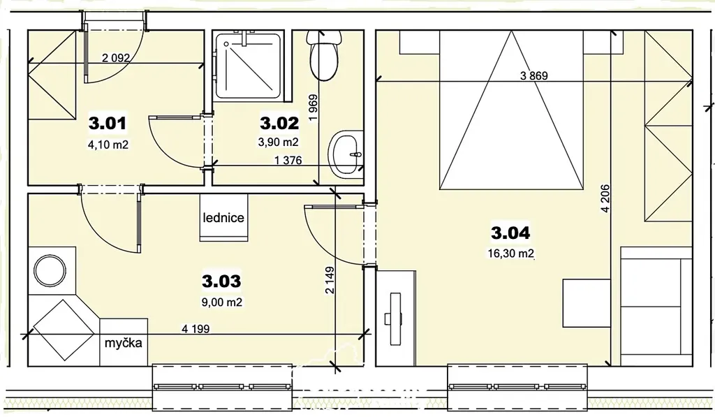 Nabízený byt č. 3 se nachází v domě Fanda a je řešen jako 1+1 o výměře 33,3 m², ideální pro jednotlivce. K bytu náleží parkovací stání (není součástí ceny) a je zde možnost přikoupení zahrádky.