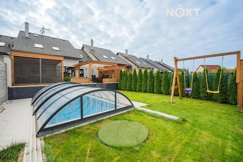 Terasa navazuje na menší, ale útulnou zahradu o výměře 223 m², kde si užijete naprostý klid, soukromí a hlavně dominantu zahrady, kterou je vyhřívaný bazén 5 × 3 m s přístřeškem.