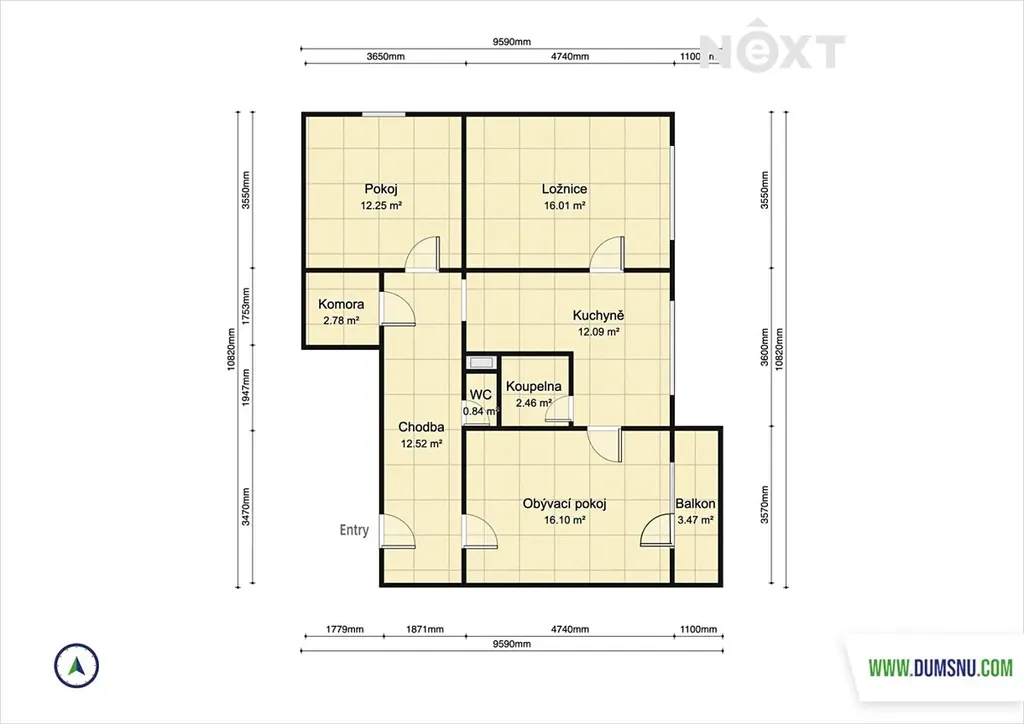 Byt o výměře 75 m2 se nachází ve 8.NP panelového domu s výtahem. Vstupní dlouhá chodba nabízí přístup do obývacího pokoje, dalšího pokoje, kuchyně, komory a samostatného WC. Z kuchyně je dále vstup do koupelny a ložnice.