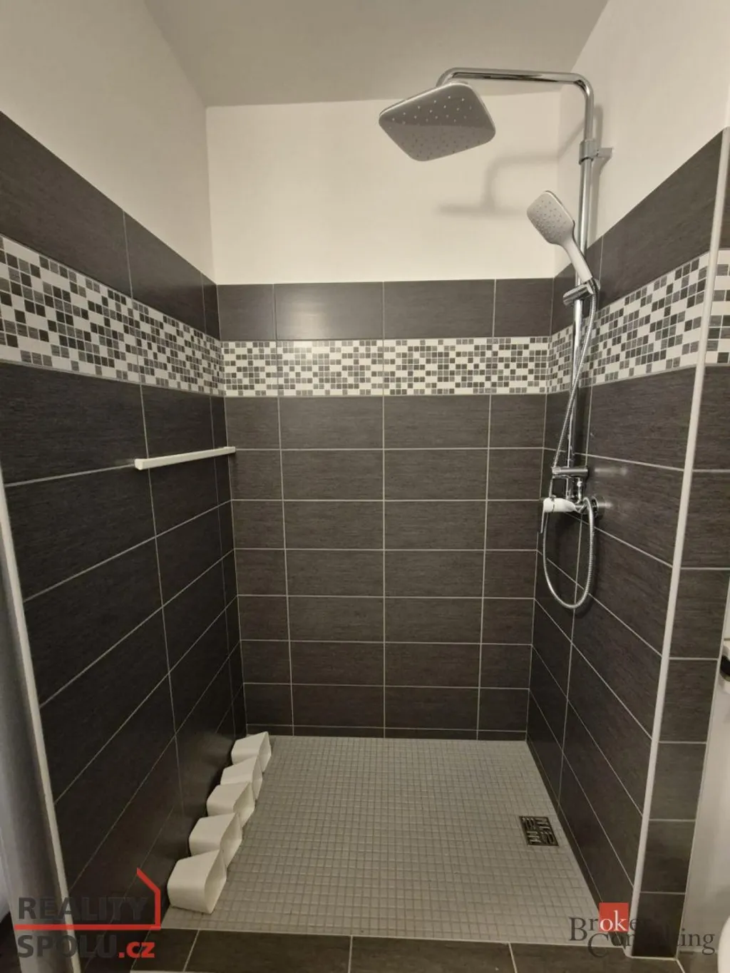 Koupelna je vybavena velkým sprchovým koutem, toaletou, umyvadlem a pračkou.