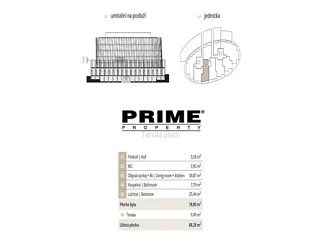 Dispozice bytu: vstupní předsíň, obývací pokoj (36m2) s jídelní částí a s otevřenou, plně vybavenou italskou kuchyní se spotřebiči (indukční varná deska, elektrická trouba, lednice s mrazákem, myčka a mikrovlnná trouba), nádobím a kuchyňským náčiním a vstupem na terasu, ložnice (25,5m2) se vstupem na terasu, koupelna (vana, sprchový kout, umyvadlo, toaleta, bidet) a samostatné WC. Dřevěné podlahy a velkoformátová dlažba. Rekuperace vzduchu, podlahové topení, internet, videotelefon, alarm.