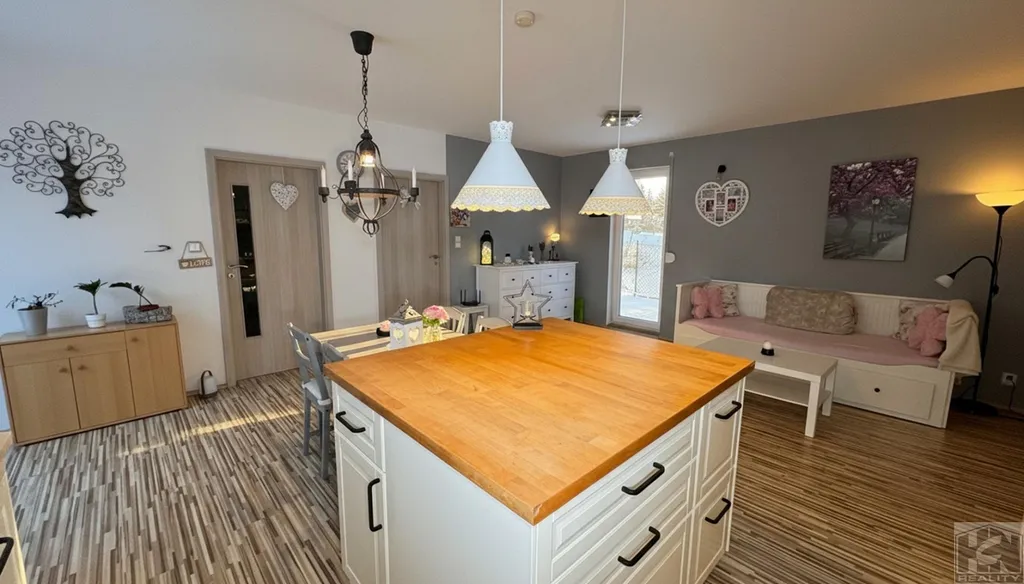 Interiér je navržen s důrazem na praktičnost i pohodlí. Dominantou domu je světlý a prostorný obývací pokoj s kuchyňským koutem, který tvoří přirozené centrum domácnosti. Dále zde najdete ložnici, dva samostatné pokoje, prostornou koupelnu s vanou i sprchovým koutem, samostatné WC, komoru a technickou místnost s úklidovým zázemím.