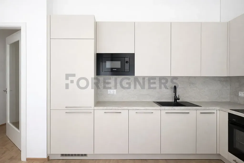 Kuchyňská linka na míru, která efektivně využívá jak pracovní prostor, tak i úložný prostor. Kuchyň je vybavena vestavěnou lednicí, troubou, indukční deskou, myčkou a mikrovlnnou troubou.
