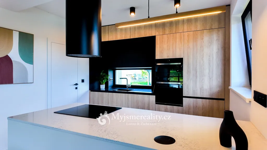 Dominantou interiéru je velkorysý obývací prostor propojený s kuchyní a jídelnou. Designová kuchyň je vybavena pracovní deskou z kamene Technistone a vestavnými spotřebiči Whirlpool a Electrolux. Interiér i exteriér podtrhuje velké množství skleněných prvků, které dodávají domu vzdušnost, světlo a moderní elegantní charakter. Celý dům je realizován z kvalitních, nadstandardních materiálů s důrazem na dlouhou životnost a precizní zpracování. Vysoký standard provedení dále tvoří vinylové podlahy, bezfalcové interiérové dveře s magnetickým dovíráním, velkoformátová okna s izolačními trojskly, elektricky ovládané venkovní žaluzie, klimatizace ve všech obytných místnostech a moderní kamerový systém.