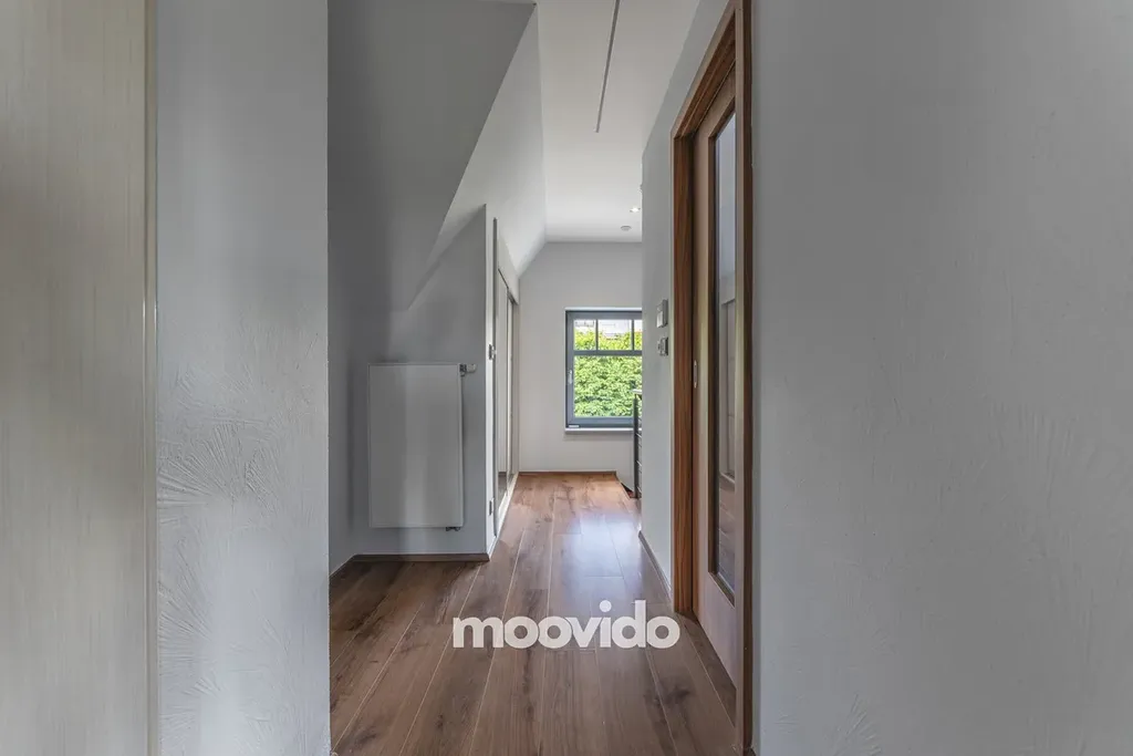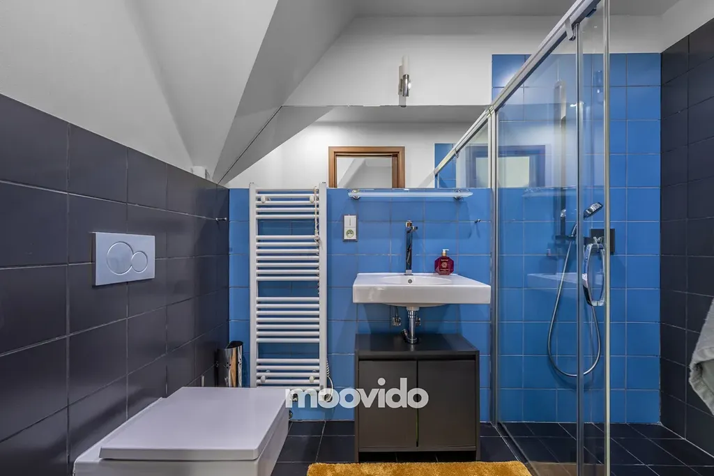 V horním patře se nachází dvě ložnice 17,5 a 9,7 m2 s vestavěnými šatními skříněmi. Větší z ložnic je klimatizovaná. Koupelna se sprchovým koutem a WC má výměru 4,1 m2. Na chodbě najdeme také vestavěnou skříň, další úložné prostory se nacházejí na půdě.
