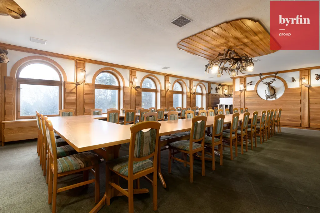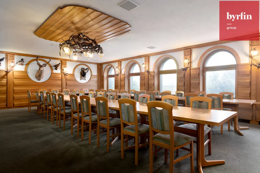 Areál tvoří třípodlažní budova s restaurací, ubytovací částí, skladovým a technickým zázemím, dvěma terasami a rozsáhlou okrasnou zahradou. Hlavní část slouží jako restaurace s kompletně vybavenou kuchyní, barem a sociálním zázemím. V 1. patře se nachází 12 pokojů, každý s vlastní koupelnou a WC, aktuálně pronajatých dlouhodobým nájemcům se stabilním příjmem cca 120.000 Kč měsíčně. V podkroví jsou dvě bytové jednotky o velikosti cca 70 m², ideální pro majitele, správce nebo dlouhodobý pronájem.