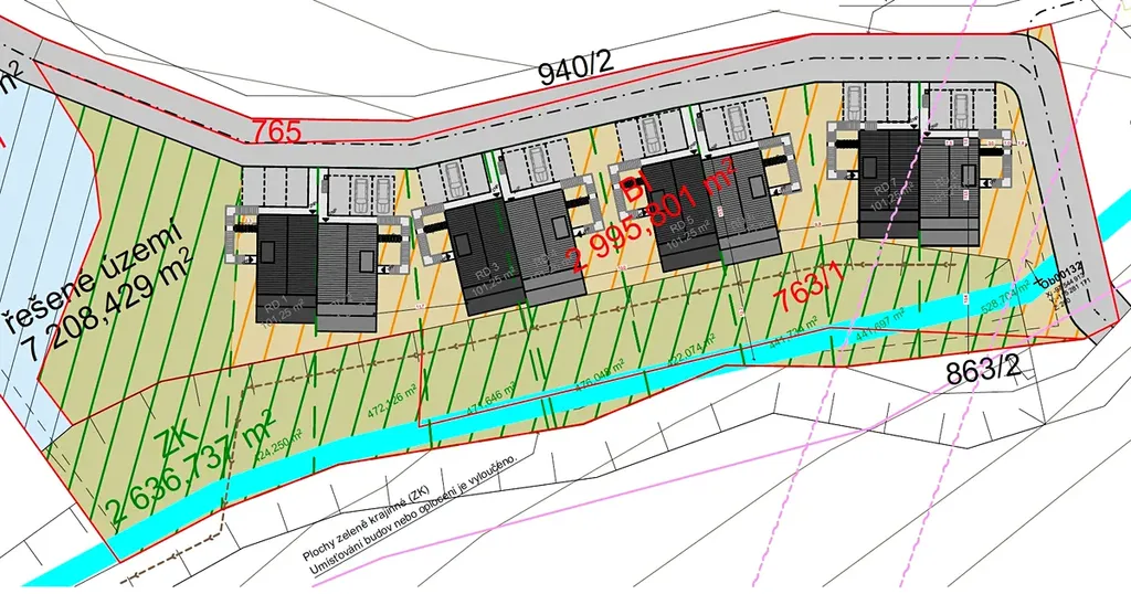 Pozemek pro výstavbu 7289 m2, 24 apartmánů ve 4 rodinných dvojdomech - 2120 m2 ČPP, Merklín, okr. Karlovy Vary.