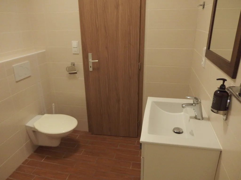 Byt má obývací pokoj s kuchyňským koutem, dva samostatné pokoje, koupelnu s vanou, umyvadlem a wc. Druhá koupelna má umyvadlo, wc a také místo pro pračku i sušičku. V chodbě jsou skříně s úložnými prostory.
