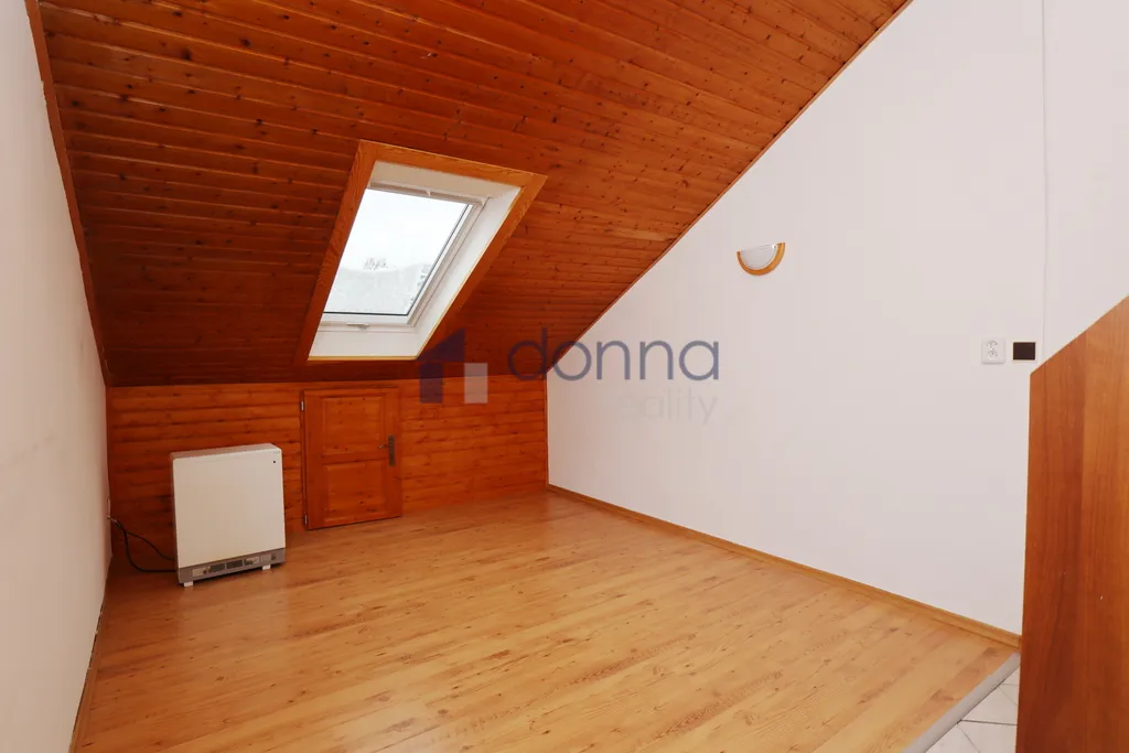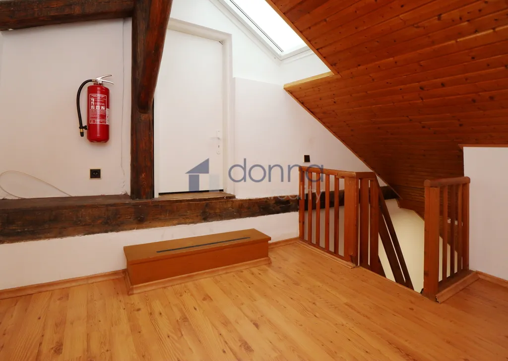Byt sestává z místnosti s kuchyňským koutem, komory, koupelny, wc. Po schodech se vchází do horní místnosti, kde je možné zřídit pracovnu, malý obývák či ložnici. Za bílými dveřmi jsou další dvě místnosti (na fotografiích jsou to pokoje se zátěžovým kobercem). Tyto místnosti má nájemce plně k dispozici jako bonus k bytu a může je využít např jako ložnici, úložný prostor apod. Je zde nižší podchozí výška.