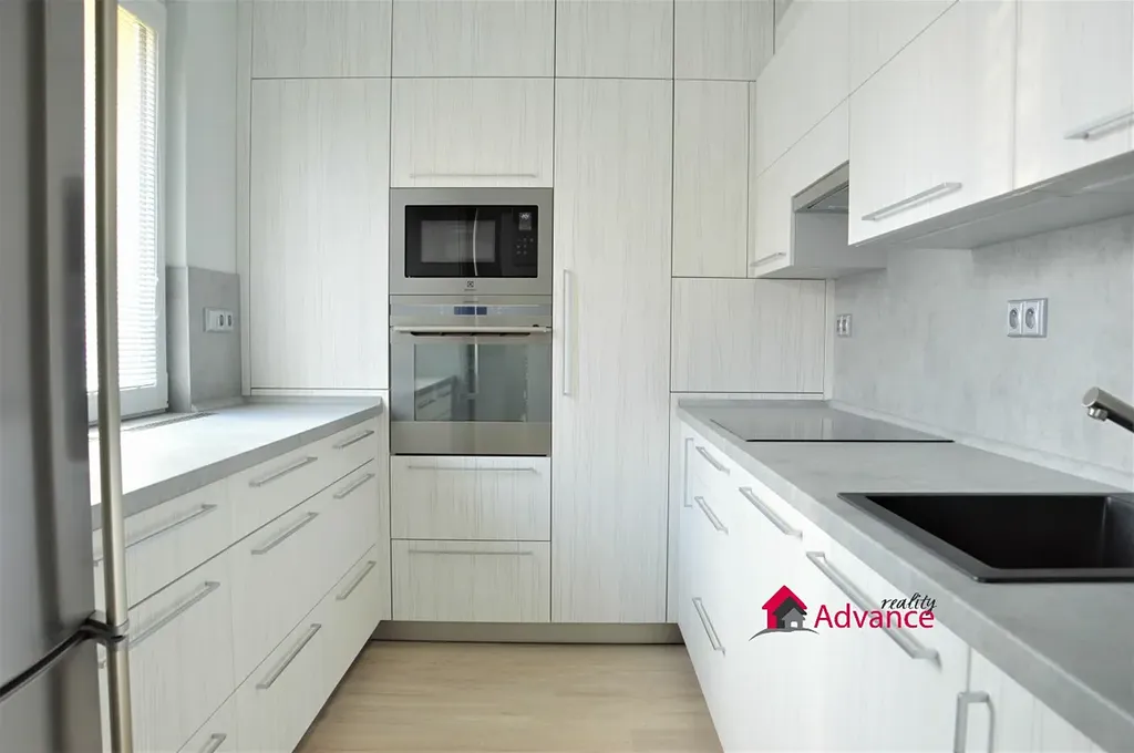 Kuchyň je vybavena moderními elektrospotřebiči značek Elektrolux a AEG – horkovzdušnou troubou, indukční varnou deskou, digestoří, myčkou nádobí a kombinovanou lednicí. Praktickým benefitem jsou vestavěné skříně v předsíni, které poskytují dostatek úložného prostoru.