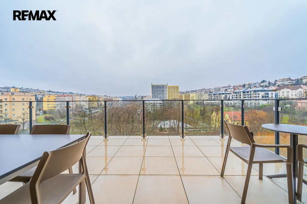 Z obývacího pokoje i ložnice je přes panoramatická posuvná okna přímý vstup na terasu o ploše cca 24 m² (7 × 3,5 m), která nabízí nádherný výhled na park Kajetánka, vilu Kajetánka, budovu oranžerie a také na osvětlené areály Břevnovského a Strahovského kláštera.
