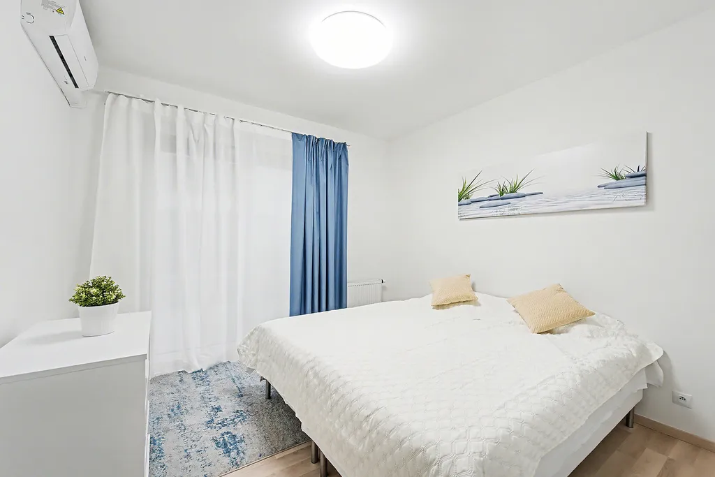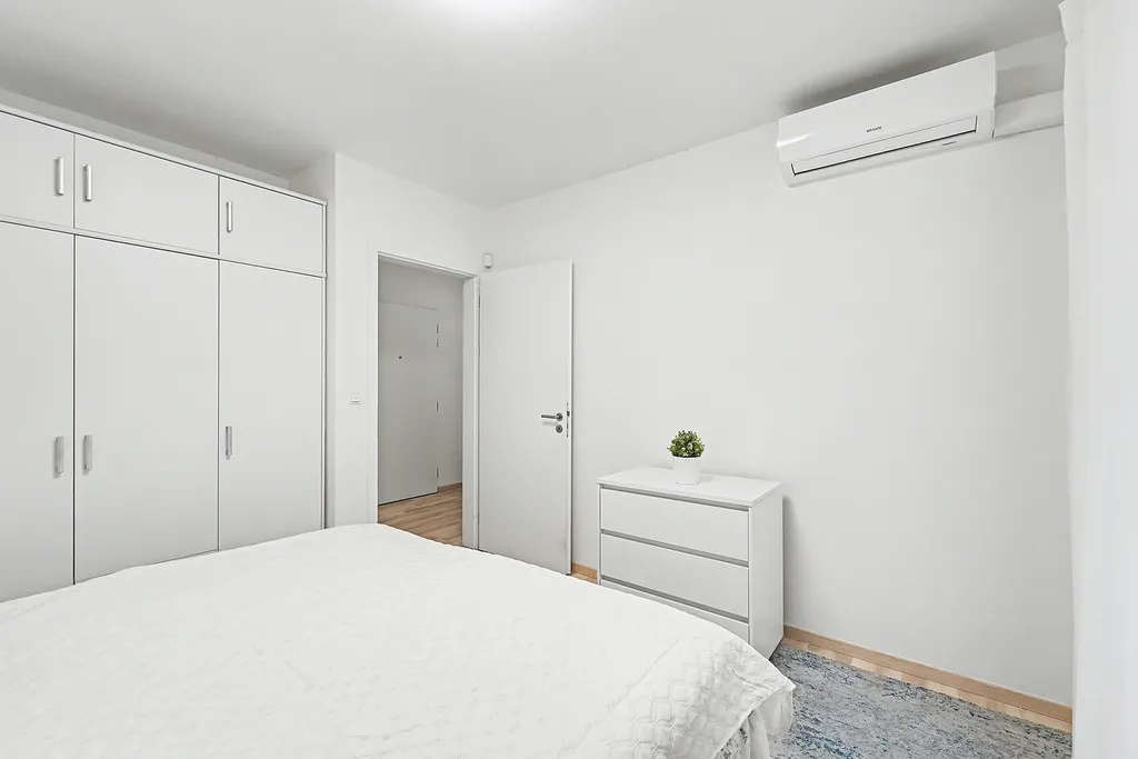 Ložnice nabízí dostatek místa pro manželskou postel i úložné prostory. Velká okna orientovaná do zahrady zajišťují dostatek přirozeného světla a příjemnou atmosféru pro nerušený odpočinek. V obou obytných místnostech je instalována klimatizace, která zajišťuje komfort po celý rok.