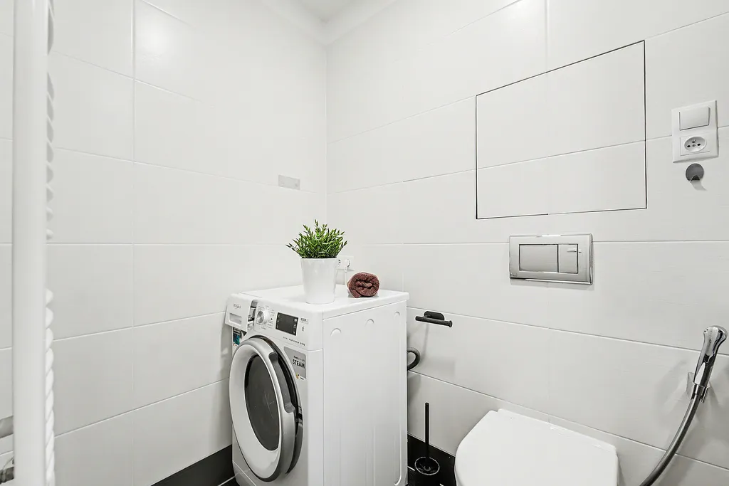 Koupelna je řešena v elegantním moderním stylu a je vybavena sprchovým koutem, toaletou, umyvadlem a pračkou se sušičkou. Praktické úložné prostory doplňuje komora přímo v bytě a sklep umístěný u parkovacího stání.