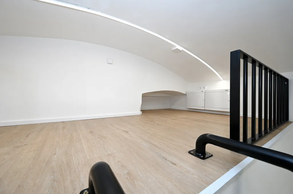 Dispozici tvoří obývací pokoj s kuchyňským koutem a barovým jídelním pultem, samostatná ložnice, koupelna se sprchovým koutem a vstupní chodba. Interiér působí velmi vzdušně, a to díky vysokým stropům, které dodávají bytu osobitý charakter. V předsíni je prostorná vestavná skříň, další šatní skříň se nachází v ložnici, takže o úložný prostor zde rozhodně není nouze.