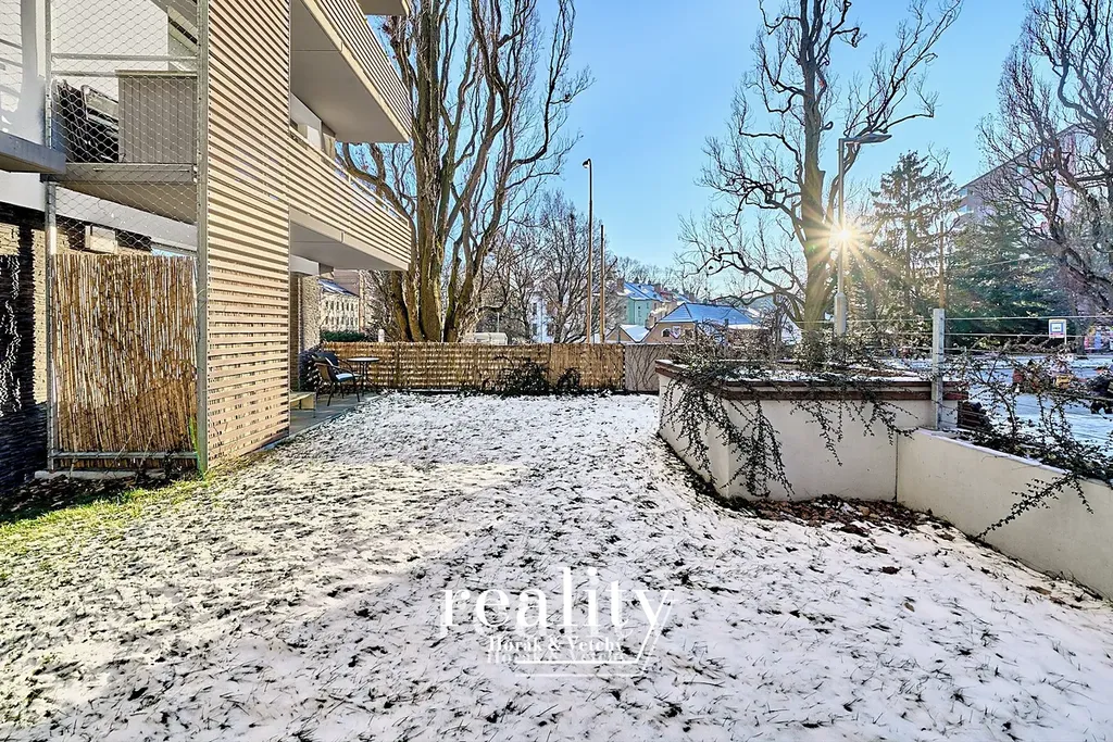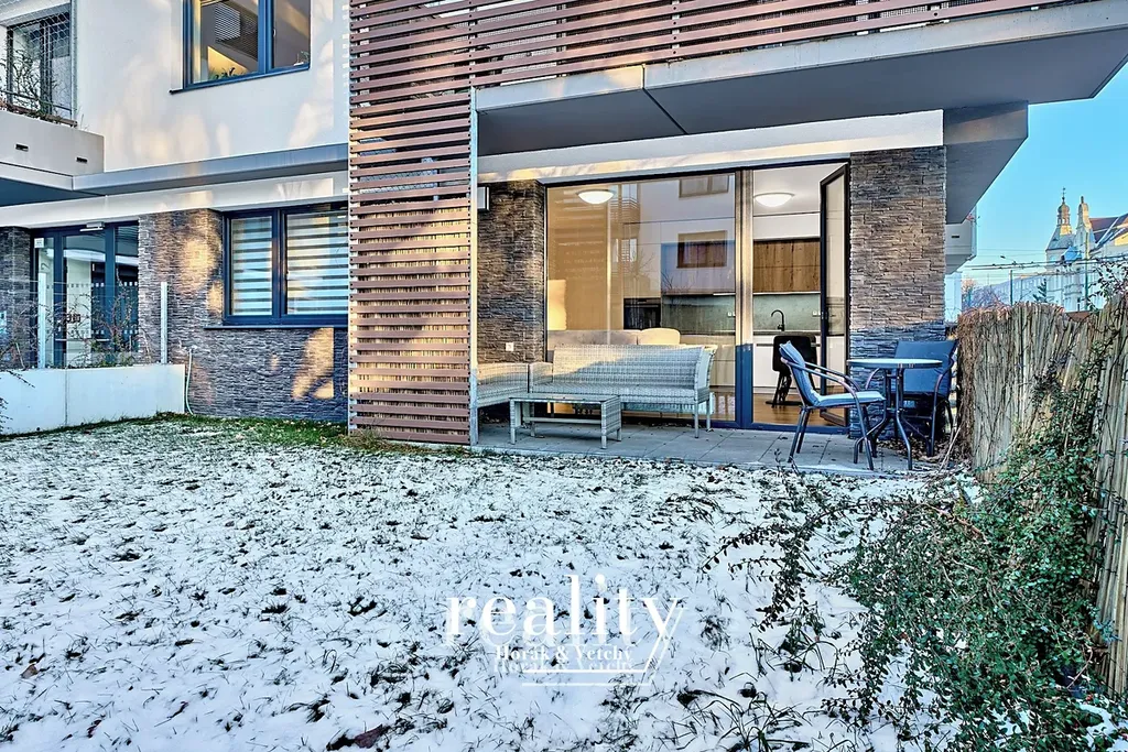 Kuchyň nabízí linku na míru včetně vestavěných elektrospotřebičů (trouba, lednička, myčka, digestoř, sklokeramická deska) a kuchyňský stůl se 4 židlemi. V obývacím pokoji je sedací souprava se stolem, na stěnách jsou dekorační prvky, ve všech oknech je instalován interní stínící systém. Z obývacího pokoje je vstup na velkou terasu se zahradním nábytkem. V dalších místnostech jsou úložné skříně nabízející dostatek prostoru a komfortu včetně manželské a jednolůžkové postele. Byt má samostatnou koupelnu a oddělené WC. Součástí nájmu je sklepní kóje ve vnitrobloku domu. K dispozici je i vnitřní garážové parkovací stání - 2 000 Kč/měsíc.