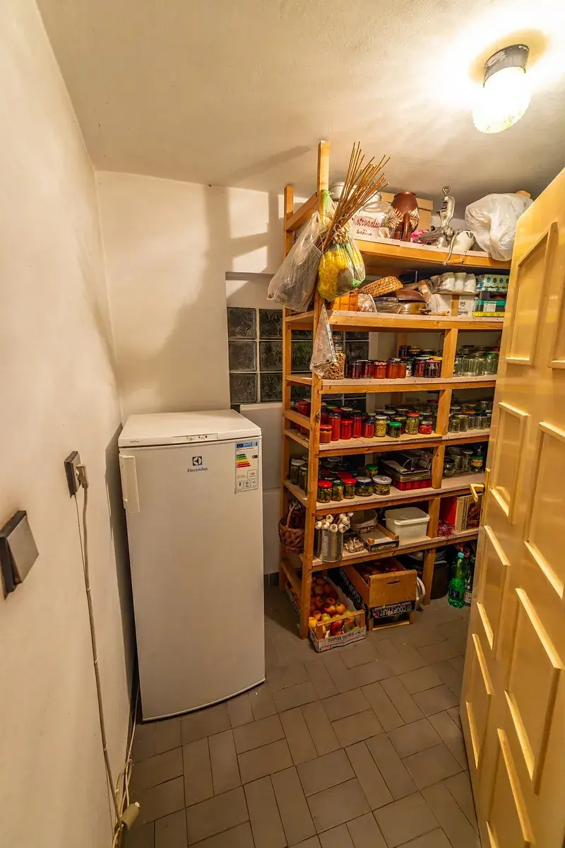 Zde vás překvapí prostorná garáž (4 x 9m), která je aktuálně využívána jako dílna – ideální pro kutily, podnikání či domácí projekty. Dále se zde nachází praktická spižírna, chodba a především letní kuchyně – druhá kuchyně v domě, která je naprosto jedinečná. Díky francouzským dveřím z ní máte přímý vstup na zahradu, což oceníte při rodinných oslavách, grilování nebo jen při relaxu v letních dnech. V suterénu je také umístěn plynový kotel pro vytápění domu.