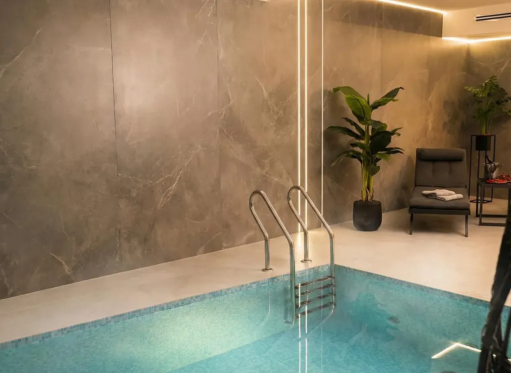 - hlavní prostor s bazénem, posezením, lehátky a kuchyňským koutem s barovou zónou,