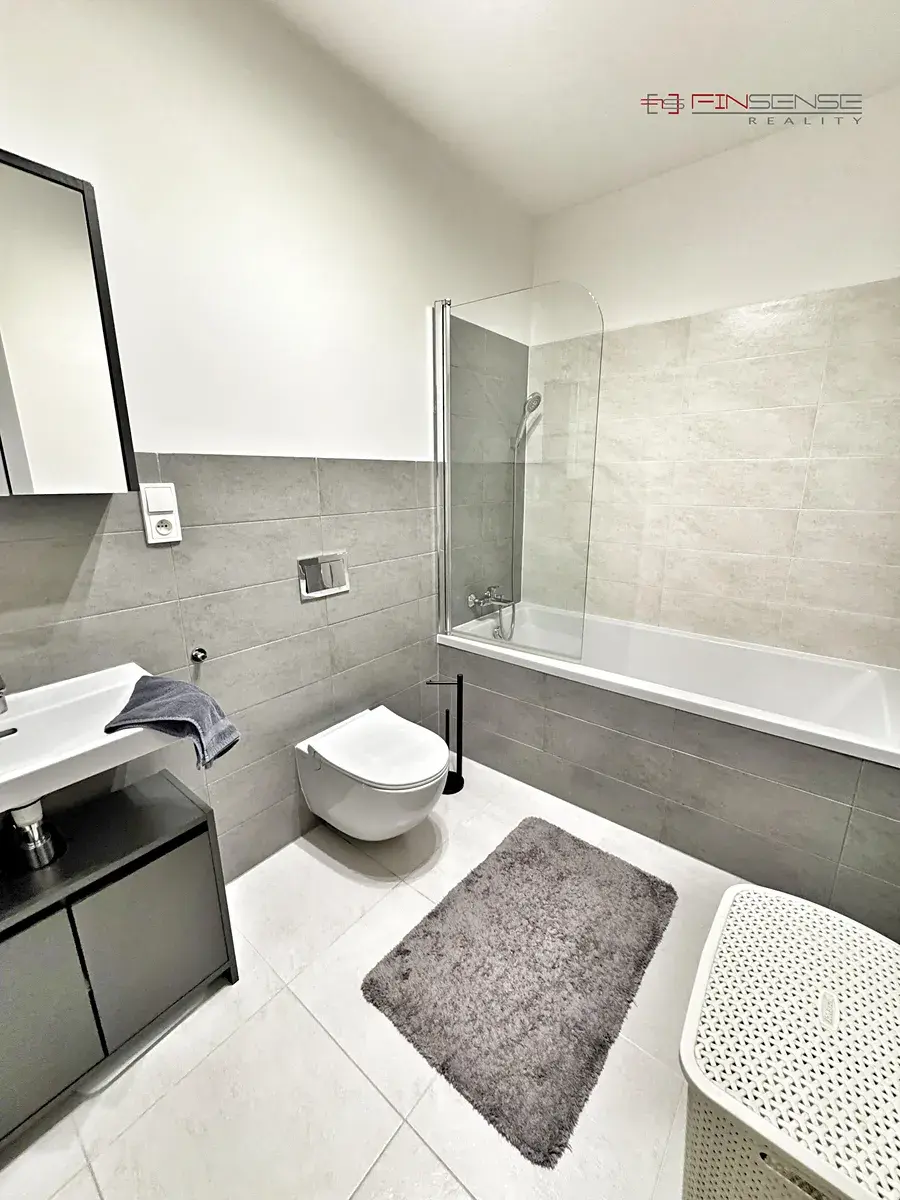 Koupelna je vybavena vanou se zástěnou, umyvadlem a toaletou. Druhá toaleta s umyvadlem je samostatná. Praktickým prvkem je technická místnost s místem pro pračku, sušičku a další úložné prostory.