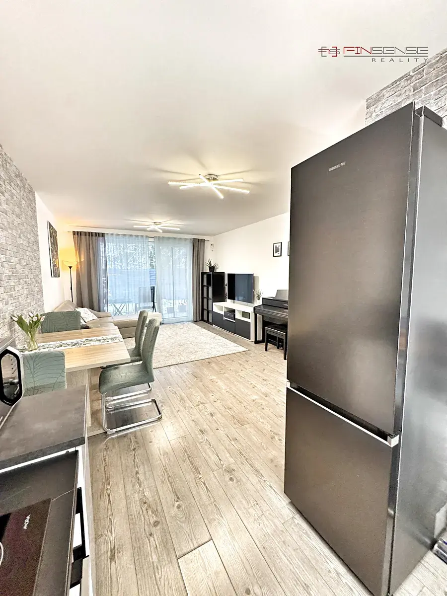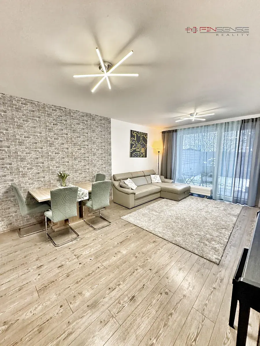 Dispozice je řešena účelně a přehledně. Z prostorné vstupní předsíně je samostatný vstup do všech místností. Dva neprůchozí pokoje lze využít jako ložnici, dětský pokoj nebo pracovnu, oba orientované do zahrady. Obývací pokoj s kuchyňským koutem tvoří hlavní obytný prostor bytu a plynule navazuje na terasu. Kuchyňská linka je součástí prodeje, ostatní vybavení je možné ponechat po dohodě.