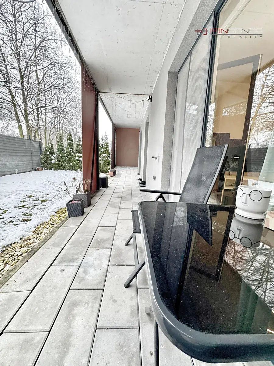 Výjimečnost této nemovitosti spočívá v soukromé zahradě s terasou vedenou po celé délce bytu, která nabízí klid a dostatek soukromí. Francouzská okna ve všech obytných místnostech zajišťují přímý vstup na terasu a do zahrady a zároveň přivádějí do interiéru dostatek denního světla.