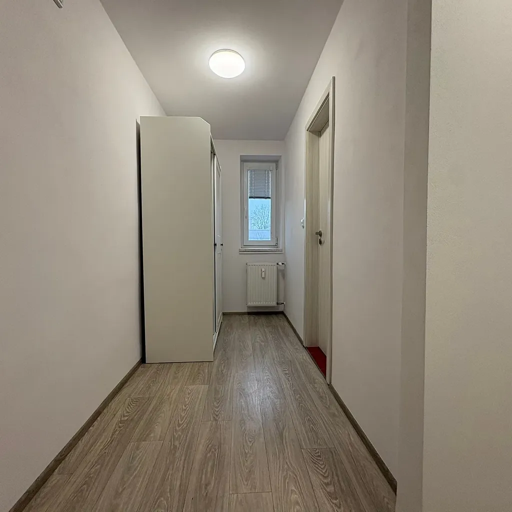 Byt má následující dispozici: obývací pokoj, ložnice, kuchyně, koupelna společná s WC, předsíň, chodba, lodžie a sklep.