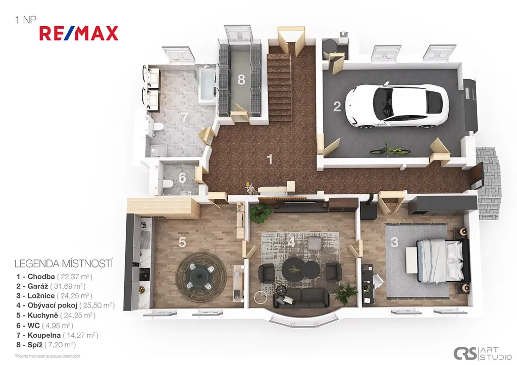 V přízemí domu je byt před rekonstrukcí o dvou pokojích, kuchyň, toaleta, koupelna, spíž a garáž. Dům je částečně podsklepen a je tu k dispozici technické zázemí domu.