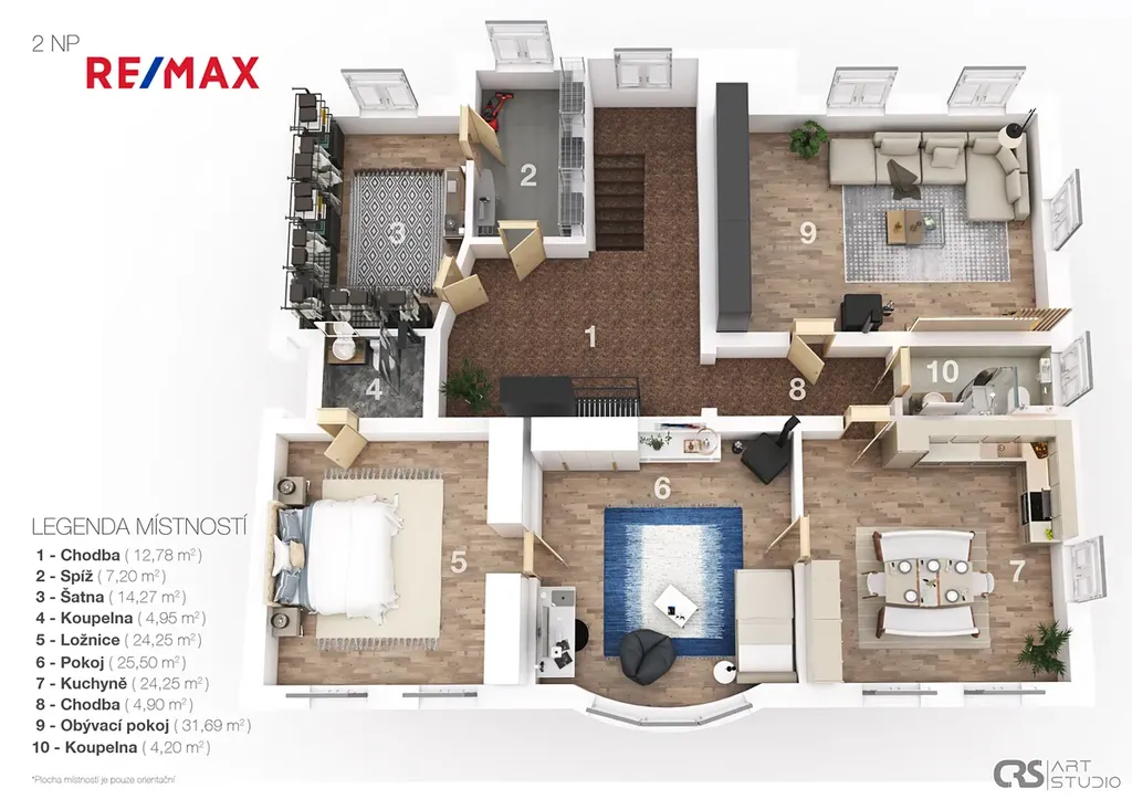 Dům má obytné 1. a 2. nadzemní podlaží, s tím, že v 2. podlaží je v současné době využíván byt o dispozici 3+1 se dvěmi koupelnami. Na patře jsou pak z chodby přístupné další dvě místnosti.