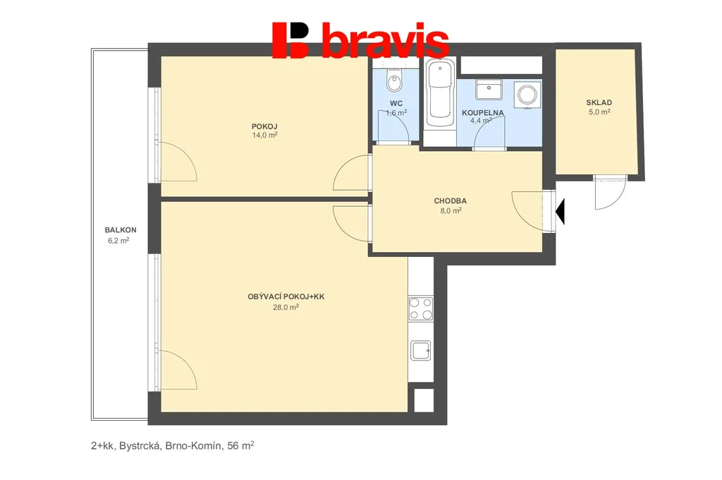 Pronájem bytu 2+kk, Brno - Komín, Bystrcká, 55 m2