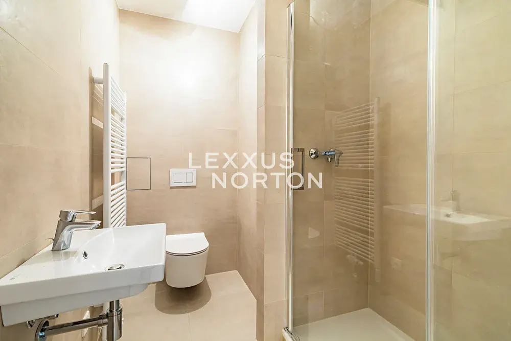 Koupelna disponuje sprchovým koutem a prostor je dále vybaven přívody pro instalaci kuchyňské linky. Podlahy jsou řešeny kombinací plovoucí podlahy a dlažby. Celý prostor je světlý, dobře uspořádaný a nabízí efektivní využití.