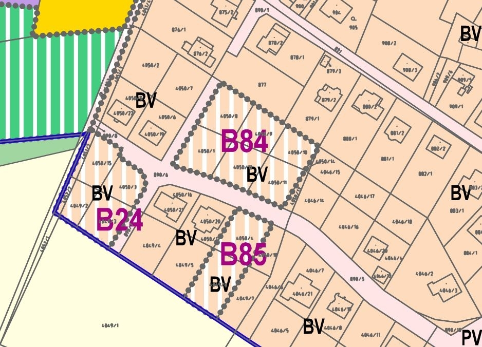 Stavební pozemek v zastavitelné ploše B84 – bydlení v rodinných domech (BV). Pozemek se nachází v zastavitelné ploše č. B84 s funkčním využitím BV – plochy bydlení v rodinných domech (venkovské). Hlavní využití je určeno pro výstavbu rodinného domu s individuálním bydlením. Územní plán nestanovuje maximální procento zastavěnosti – konkrétní záměr tedy bude posuzovat stavební úřad. Výšková regulace umožňuje výstavbu až 2 nadzemních podlaží, tedy jak bungalov, tak klasický dvoupodlažní dům. Nová výstavba má respektovat charakter okolní zástavby – v lokalitě převažují sedlové a valbové střechy, které by měly být zachovány i u nových domů. Uliční čára není pevně stanovena, ale vychází se z místního urbanistického uspořádání – domy jsou zde obvykle umisťovány v přední části pozemků, zatímco zadní část slouží jako zahrada. Další výhodou je jasné pravidlo, že podél komunikace je přípustná pouze jedna řada rodinných domů – za první řadou již další výstavba není možná. Budoucí soukromí tak zůstává zachováno. Ideální příležitost pro ty, kdo chtějí stavět rodinný dům v klidné lokalitě s jasně nastavenými pravidly a bez rizika zahušťování zástavby v budoucnu.