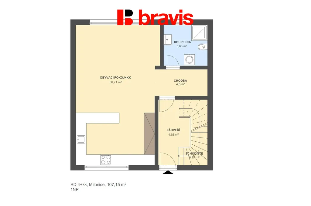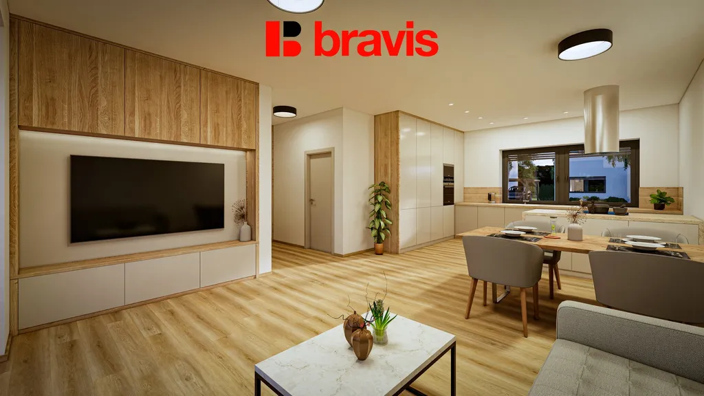 V přízemí najdete vzdušný a světlý obývací pokoj spojený s moderním kuchyňským koutem (37 m²).