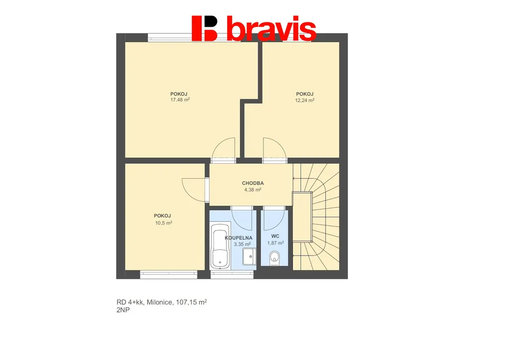 V patře Vás čekají tři samostatné ložnice (10 m², 18 m²,12 m²), které nabízí dostatek prostoru pro pohodlné bydlení celé rodiny.