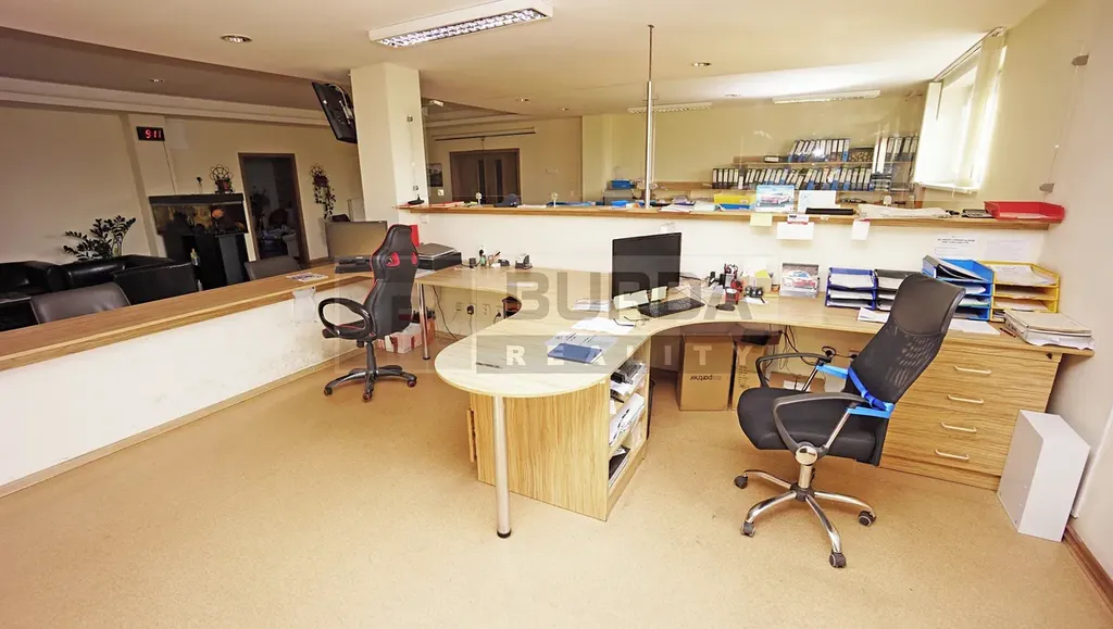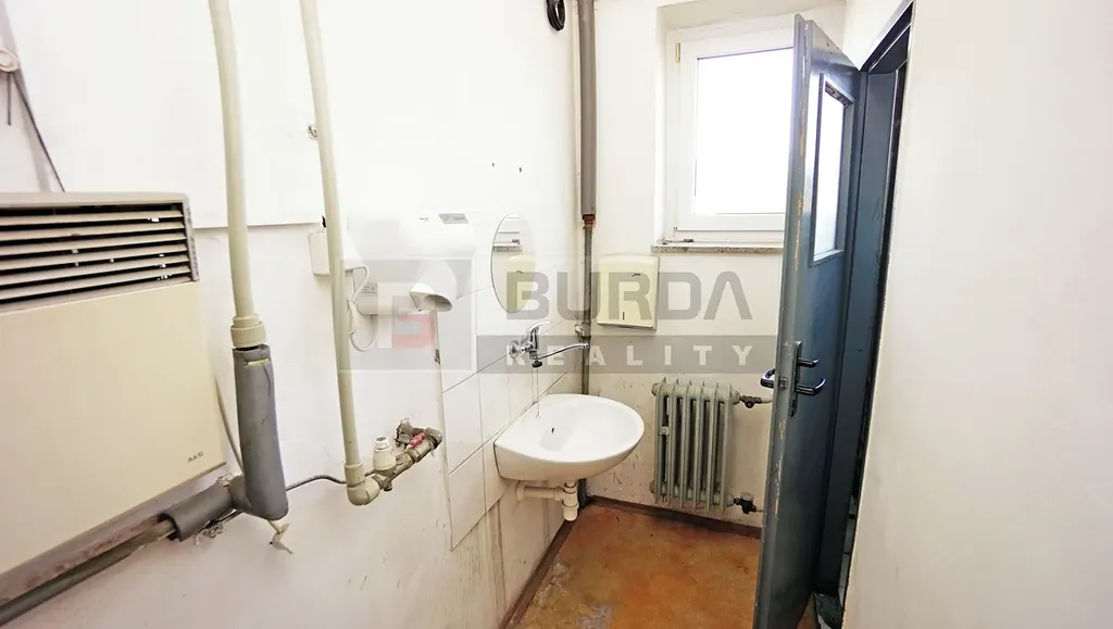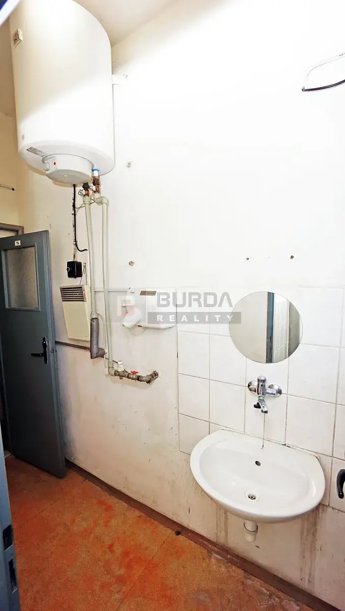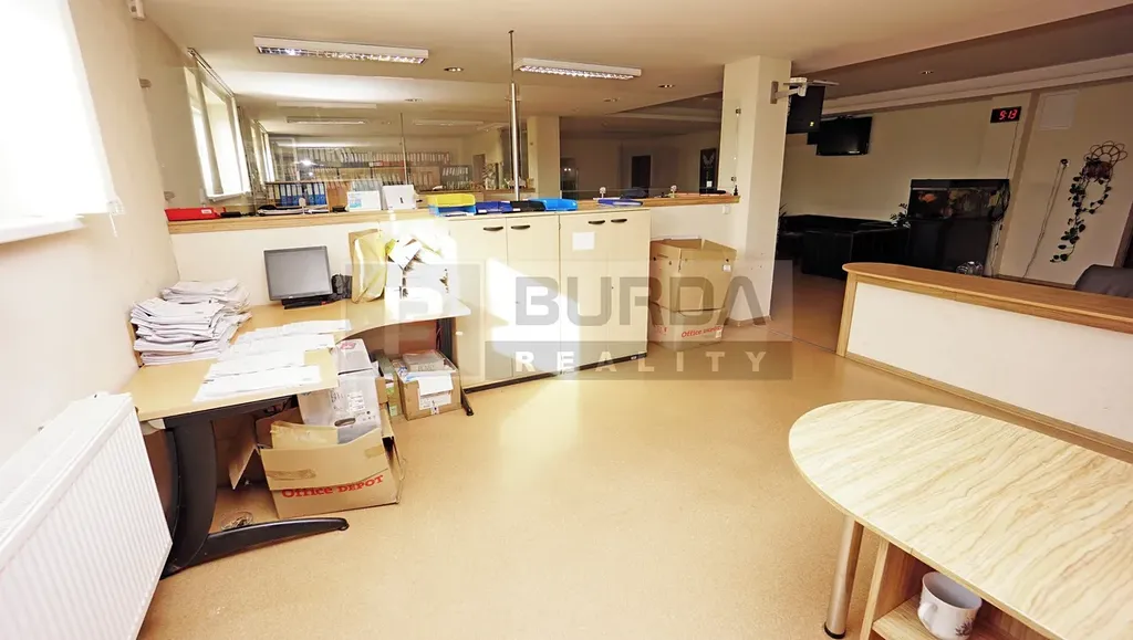 Ve stejném areálu je možné si pronajmout kancelář (jeden modul v otevřené kanceláři) o výměře 4,9 m x 4,9 m = 24 m2 za 7000 Kč měsíčně + 3000 Kč paušál elektřina (na vytápění, světlo, PC a spotřebiče), na přání klienta lze oddělit sádrokartonem. K dispozici je sdílená sociálka (předsíňka, WC, sprcha, umyvadlo). Přístup se sdíleným vstupem.