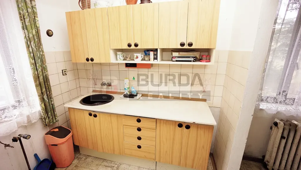 V kuchyni je původní kuchyňská linka bez sporáku a nerezová digestoř.